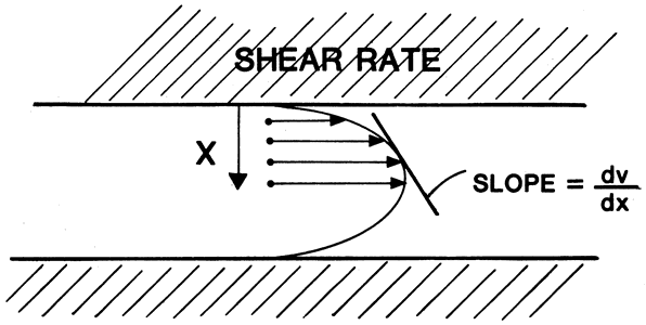 not used as bulk or volume vitreous substitutes. The relatively high viscosity or resistance to flow of these commercially available viscous agents is their most striking characteristic. At the molecular level, viscosity arises from the interactions of relatively large molecules as their concentration increases. Pseudoplasticity is an important concept that explains how some of the relatively thick solutions can be extruded through a small-gauge cannula.30 A pseudoplastic fluid is one in which the viscosity actually decreases as the shear rate of the fluid increases.31, 32 The relationship of shear rate to flow through the needle can be understood by visualizing the velocity profile of the fluid as it flows through the lumen of the needle. At the wall of the needle, the velocity is zero. In the center of the fluid, velocity is maximum. In between a parabolic curve represents the velocity, which is zero at each wall and maximal at the center of the needle. The tangent to this curve, which is the slope at any given distance, x, across the lumen of the needle, is the shear rate and is expressed as dv / dx (Fig. 1). Thus, the shear rate is much higher, and the apparent viscosity is vastly lower near the wall of the needle for extremely pseudoplastic fluids such as hyaluronic acid. The vastly lower viscosity near the wall of the needle decreases the resistance to flow enormously. This allows the pseudoplastic fluid in the central channel of the needle to flow almost as a plug. This explains the paradox that concentrated hyaluronic acid has high apparent viscosity at rest but can still be injected through a 30-gauge needle. The pluglike flow through a small-diameter needle also explains the extruded appearance of the hyaluronic acid from the end of the needle. Hyaluronic acid at a 1% concentration is the most pseudoplastic of the commercially available substances and therefore can be injected with 27- to 30-gauge needles. Hydroxypropyl methylcellulose (HPMC) is less pseudoplastic and requires a larger (23 to 25) gauge needle for injection. Another important concept is the Reynolds number, the dimensionless number that can be used to determine whether a fluid system is more likely or less likely to develop a turbulent or rough fluid flow. Fluid systems that have a Reynolds number of more than 2,000 may develop turbulent flow, those with a Reynolds number less than 2,000 generally will not. The Reynolds number is equal to the characteristic velocity of fluid, multiplied by a characteristic length, multiplied by the fluid density, and divided by its viscosity. An eye filled with BSS has a Reynolds number of around 5,700 (Table 3). When 0.4 mL of 1% hyaluronic acid is added the Reynolds number is reduced to approximately 250 once the hyaluronic acid goes into a uniform solution in the vitreous. Thus, relatively small amounts of hyaluronic acid in the posterior segment can result in reducing turbulent and rough fluid motions at the retinal surface.