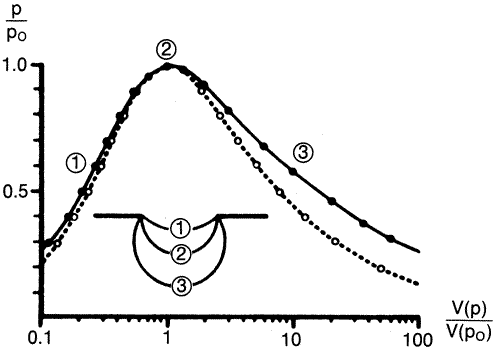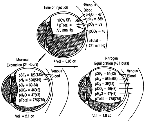 little change in an intraocular gas bubble during anesthesia. The kinetics of the less water-soluble gases such as SF6 and perfluorocarbon are much more complex and have been studied in substantial detail.71–78 Injection of a bubble of 100% SF6 or perfluoropropane leads to expansion of the bubble. The volume continues to increase, reaching a maximum after 2 to 4 days for SF6 and 4 to 5 days for perfluoropropane. The main constituent gas that leads to expansion of the gas bubble is nitrogen. About 10% of the gas bubble concentration is carbon dioxide and oxygen, which remain at a fairly constant low concentration throughout the life of the gas bubble. Eventually, the partial pressure of nitrogen in the bubble equilibrates roughly with the nitrogen partial pressure in the capillary blood. The proportions of gases in the bubble then remain constant as the bubble volume gradually decreases and all the gases leave the eye at the same rate. Because the long-acting gas is the slowest to leave the eye, it essentially controls the rate of clearance of the bubble volume in the final stage. This dynamic has been summarized as having three phases (Fig. 4). The first phase is bubble expansion caused by rapid diffusion of nitrogen into the bubble. The second phase lasts from maximum expansion of the bubble until the nitrogen concentration in the bubble is stable and roughly the same as its concentration in venous blood. The third phase is from the time of nitrogen equilibration until the bubble is reabsorbed. The clearance of gas in the third stage is approximately described as a first-order exponential equation having the form V = V0ekt, where V0 is the volume at the time of equilibration of nitrogen concentration with that in the blood and V is the volume at any subsequent time, t. K is a constant for a particular gas. A half-life for the bubble determining the time it takes for V to equal one half of V0 can be calculated once k is determined. Perfluoromethane, perfluoroethane, and perfluoro-n-butane also have an exponential decay pattern. This description must be regarded as approximate because it would imply that small bubbles would just get smaller but never really disappear. This is contrary to observation because smaller bubbles are noted to disappear rather abruptly. The half-life of the disappearance phase of SF6 has been reported to be 2.4 to 2.8 days and that of perfluoropropane to be 4.5 to 6 days. The gases are removed from the eye more rapidly when the eye is either aphakic or pseudophakic. The bubble lasts much longer in the presence of severe hypotony. Many publications indicate the average time to disappearance of bubbles of various size and of various gas mixtures with air injected into the vitreous. From clinical and animal observations, the actual time of disappearance depends on concentration of the gas, the size of the gas bubble injected, whether the patient is aphakic or phakic, and whether there is a hypotony. The theoretical factors governing gas leaving the eye are the molecular weight of the gas, diffusion coefficient of tissues, water solubility of the gas, intraocular pressure, inflow rate of ciliary body secretion, phakic or aphakic status, hypotony, vitrectomy, stirring of vitreous fluid by ocular motion, bulk outflow of aqueous through trabecular meshwork, posterior choroid venous concentration of gases, and vascular perfusion rate of the choroid. In most models, the most important factors seem to be the water solubility of the gas, hypotony, aphakia, vitrectomy, and bulk flow of water from the eye. Theoretical models show reasonable approximate results but are too complex to accurately predict what will happen for an individual patient. Certainly, determining the optimal size and composition of a gas bubble injected into a specific patient in a specific circumstance is part of the art of vitreoretinal surgery at this time.79 One approach to gas injection is to estimate the maximum bubble size expected from the amount injected. Excessive volumes of pure expansile gases can lead to a maximum bubble size larger than the ocular volume. Extremely high pressures resulting in central retinal artery occlusion and loss of light perception then occur. One would also like to keep the maximum size of the gas bubble slightly less than vitreous volume to prevent cataract formation in phakic patients and corneal opacification in aphakic patients. Ratios of the maximum volume of the expanded gas bubble to the original volume of injected gas are for SF6, 2; for perfluoromethane, 2; for perfluoroethane, 3.25; for perfluoropropane, 4; and for perfluoro-n-butane, 5. Another approach to the problem of an expanding gas bubble is to inject nonexpansile or a slightly expansile concentration of the gas. The nonexpansile concentration of SF6 was initially reported at 40%. Most surgeons err on the side of caution by using a 20% concentration of SF6 when attempting a total or near-total fluid–gas exchange at the conclusion of vitrectomy. A nonexpansile concentration of perfluoropropane is thought to be 12%.80 Surgeons frequently use concentrations between 10% and 16% perfluoropropane for large posterior segment tamponades. In pneumatic retinopexy, in which relatively small volumes of gas are injected, pure gases can be safely used because they are unlikely to overfill the vitreous volume. An estimate has been made of the amount of time a therapeutic volume of gas is maintained by injection of 0.3 mL of gas. A therapeutic volume of gas for pneumatic retinopexy has a 90-degree arc of contact and will tamponade a break for approximately 1 clock hour. The amount of time estimated for the presence of therapeutic volume of gas is for air, less than 1 day; for SF6, 3 to 4 days; for perfluoromethane, 2 days; for perfluoropropane, 16 days; and for perfluoro-n-butane, 30 days.81 SF6 and perfluoropropane are the most common gases used in small volume injection for pneumatic retinopexy. There are report