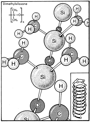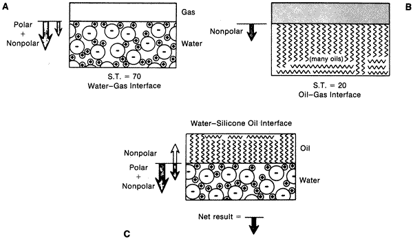 work predated the development of vitrectomy. Because of early clinical and laboratory reports of severe silicone oil retinopathy and because of the subsequent development and success of vitrectomy surgery for PVR, silicone oil was not used in the United States in the late 1960s and 1970s.106 Scott107 continued to use silicone oil with a viscodissection technique in Great Britain. He performed dissection of vitreous membranes with the indirect ophthalmoscope using needles and early vitrectomy scissors. Haut and associates,108 in France, were the first to use silicone oil as a modern tamponade after vitrectomy. In Holland, Zivojnovic and colleagues109 aggressively developed the full potential of silicone oil as an adjunct to vitrectomy surgery. Ando made a major contribution to the use of silicone oil with vitrectomy by noting that a 6 o'clock peripheral iridectomy substantially reduced the incidence of silicone keratopathy in aphakic patients. In 1992, a multi-institutional randomized study showed that silicone oil was superior to SF6 and equal to perfluoropropane in repairing PVR detachments in conjunction with vitrectomy.110 BASIC SCIENCE CONSIDERATION FOR SILICONE OILS The chemistry of silicone oil begins when silicone dioxide (sand) is reacted with carbon at a high temperature, resulting in silicium.111 Silicium is reacted with methylchloride, whose product is then reacted with water. The result is dimethylsilanediol, which polymerizes into long chains of silicium oxygen molecules with two methyl groups on each silicium. The polymer chains continue to grow in length until a trimethyl group is placed at each end of the chain. The greater the length of the polymer, the greater the viscosity of the resulting silicone oil. During the synthesis of silicone oil, mixtures of different chemical substances can result. Therefore, the chemical composition of a particular silicone oil depends on the manufacturing process. The most commonly used silicone oil clinically is methyl-3,3,3 polydimethylsiloxane. This is the familiar silicone oil that is lighter than water. The methyl groups, however, can be substituted with trifluoropropylmethyl or methylphenyl side chains, which result in heavier than water silicone oil. The silicone oil chains form a helix with approximately six silicium units per turn. A pure 1,000-centistoke oil will have a helix of 63 turns and a 5,000-centistoke oil a helix of approximately 100 turns (Fig. 7).112 Interdigitation of the helix accounts for part of the viscosity, as does the increasing molecular weight of the larger molecules. Temperature dependence of the viscosity of silicone oil is shown by the fact that 1,000-centistoke dimethylsiloxane at room temperature has a viscosity of 800 centistokes at body temperature. Because aqueous and silicone oils are immiscible, buoyancy occurs. The density of aqueous humor is 1.01 g/mL. The density of regular silicone oil at body temperature is 0.96 g/mL, and the density of the trifluoropropylmethylsiloxane at body temperature is 1.29 g/mL. The lighter silicone oil floats on the water, whereas the heavier silicone oil sink beneath the aqueous phase. The buoyant force of a regular silicone oil bubble with a volume of 5 mL is approximately 0.25 g. The downward force of the fluorinated silicone oil can be as much as 1.3 g. This downward force is distributed over the surface of the bubble and is greatest in the directly vertical axis. It tapers off to zero on the retinal surface parallel to the vertical axis. For regular silicone oil, the most important implication of buoyancy is that it directs the tamponade of the immiscible silicone oil upward. With the heavier-than-water silicone oils, the negative buoyancy is sufficiently great that it becomes a valuable intraoperative tool in expressing subretinal fluid from beneath the retina through peripheral tears. The heavier oils are also valuable in defining residual membranes on the retina by putting them on the stretch. Surface tension is the most important means by which silicone oil assists in tamponading retinal tears for retinal reattachment. Surface tension between air and liquid was discussed earlier. The interface between silicone oil and water is somewhat more complex. The short range forces at the surface that give rise to surface tension are diminished between the water/oil interface relative to the water/air interface. This is because there is some attractiveness between the water and oil molecules that diminishes the dispersive forces and, therefore, the surface tension (Fig. 8). Strong polar forces give a further boost to surface tension at the water/hydrocarbon interface. Strong polar forces play a similar role in the silicone oil/water interface. Although in a successful retinal reattachment no fluid is seen in the area of successful tamponade, the retina itself and the choroid underlying the tamponaded retinal break may be thought of as being an aqueous phase material. A rough theoretical calculation gives the surface tension between pure water and regular silicone oils as approximately 50 ergs/cm2,113 An actual measurement of pure water and silicone oil was 40 ergs/cm2. When physiologic saline was used, surface tension was found to be 33 ergs/cm2. If hyaluronic acid solution is used during the surgery and remains in the aqueous phase, surface tension may be reduced to 25 ergs/cm2. The surface tension may be further decreased by surfactants or surface-active agents. Surfactants coat the interface between the oil and the aqueous phase vitreous fluid since they are partially soluble in both phases. This makes the transition between the two immiscible liquids less abrupt.114 The most important van der Waals' forces at the interface are of very short range (on the order of one molecular layer). Thus, a surfactant that is one molecular layer thick can substantially decrease the dispersive force at the surface of the liquids. Because the dispersive force is decreased, there is