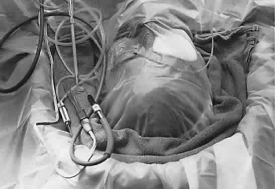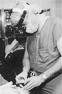 A hand support is preferred for vitrectomy surgery (Fig. 5). The surgeon rests both hands throughout the operation, avoiding fatigue and achieving fine control for intravitreous manipulations. The level of the hand support usually is at the patient's ears but should be individualized for the surgeon and patient. A sterile plastic drape, used to cover the patient, is pushed down into the space between the patient's head and the hand support. This forms a trough to collect fluid that would otherwise spill onto the floor. The microscope also can be covered with a sterile plastic drape.