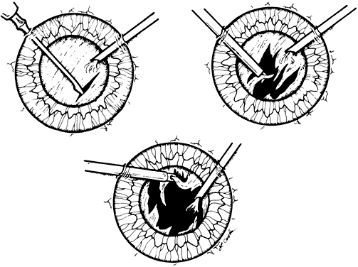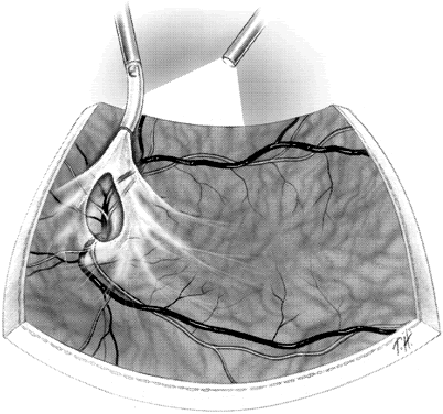 Membrane delamination usually is a bimanual technique for vascularized membranes such as in PDR. Using an illuminating pick to elevate the vascularized membrane, adhesions between the fibrovascular tissue and retina are cut with horizontal scissors (Fig. 25). Fibrovascular membranes often are extremely adherent to the retina and may overlay thin, ischemic retina. If a retina break is created in membrane removal, all traction must be removed completely from the retina. Viscodelamination, which is the use of a viscoelastic solution to create a cleavage plane between the membrane and retina, may assist in delamination.90,91 The delamination technique is used for en bloc resection of membranes.92–95 With the en bloc technique, the posterior hyaloid is left intact after a core vitrectomy. The hyaloid provides counter-traction to the membranes being delaminated. The delaminated membranes and posterior hyaloid are then removed as a single unit (en bloc).