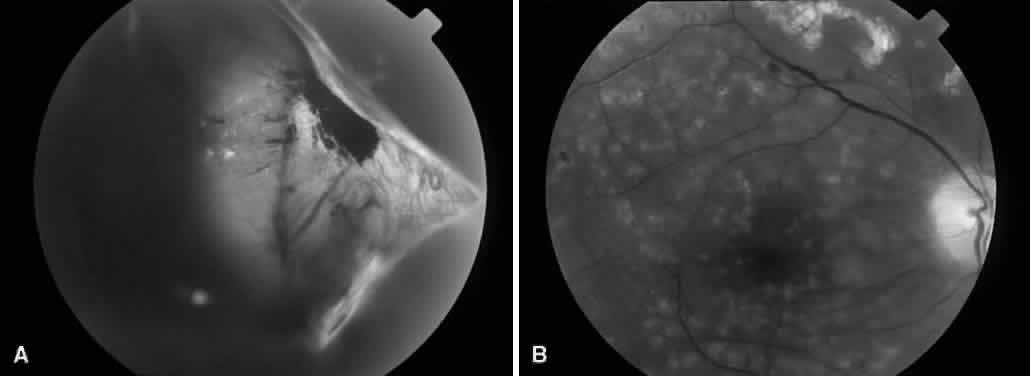 DENSE PREMACULAR HEMORRHAGE Whereas most subhyaloid hemorrhages clear spontaneously, some eyes with dense premacular hemorrhage develop premacular fibrosis or traction macular detachment. Some authors suggest that vitrectomy in such eyes may improve visual prognosis. This has not been conclusively proven in prospective trials. Eventually, data from the Diabetic Retinopathy Vitrectomy Study should become available regarding such patients, hopefully clarifying the indications and timing of vitrectomy for eyes with premacular hemorrhages. DENSE VITREOUS HEMORRHAGE IN THE PRESENCE OF IRIS NEOVASCULARIZATION In patients with potential for useful vision who present with dense vitreous hemorrhage and iris neovascularization or neovascular glaucoma, delaying vitrectomy to wait for possible clearance of the hemorrhage is not a viable option. These eyes require prompt panretinal photocoagulation to treat the anterior segment neovascularization. Vitrectomy allows clearance of media opacity so that panretinal endophotocoagulation can be applied. |
