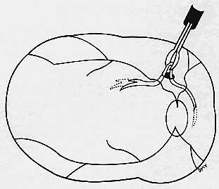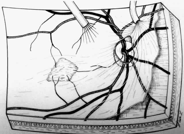 When the vascular connection from the choroid is about to be severed, the intraocular pressure is raised to approximately 80 mm/Hg. Despite this precaution, minimal hemorrhage is often countered when the membrane is removed. In one early case, while attention was directed to removing the neovascular complex through the sclerotomy, a massive hemorrhage occurred beneath the retina. In two additional cases, enough blood accumulated in the subretinal space to require removal with subretinal forceps. We now maintain the intraocular pressure elevated for at least 1 minute and watch closely for any evidence of rebleeding while the pressure is slowly lowered. If more bleeding occurs, the intraocular pressure is raised again. After the implementation of these measures, significant subretinal hemorrhage has not occurred in the last 60 cases. Once hemostasis is achieved, the membrane is extracted through the sclerotomy for pathologic examination or it is cut and aspirated with the vitrectomy probe. Occasionally, large membranes cannot be removed through a standard size sclerotomy. We prefer dividing the membrane into smaller pieces with intraocular scissors rather than enlarging the sclerotomy. Plugs are placed and scleral depression is performed 360° to verify that no peripheral retinal tears have occurred. A complete air-fluid exchange is next performed. We use standard extrusion needles or silicone-tipped needles for the exchange, with the aspirating tip over the optic nerve. In early cases, once the retina was flat, endolaser burns were applied around the retinotomy. The resulting laser scars were eccentric from the fovea but did occasionally produce symptomatic scotomas. In the past 60 cases, we have used no laser and have found the retina to remain attached. Our use of intraocular tamponade has also undergone evolution. Initially, we used nonexpansile concentrations of sulfur hexafluoride or perfluoropropane and encouraged facedown positioning for 1 to 2 weeks. As improved instrumentation allowed smaller retinotomies, we have questioned the need for gas tamponade. We perform fluid-air exchange and leave the eye with a one-half to two-thirds fill of filtered air. In the most recent 15 cases, we have gently reinfused balanced salt solution over the optic nerve after the vitreous cavity has been dry for a few minutes. The eye is completely filled with fluid, and no special positioning is used. In each of these cases, the posterior hyaloid has been meticulously removed. In each case the retinotomy has sealed without gas tamponade. Additional cases will be required before this modification can be widely advised. |