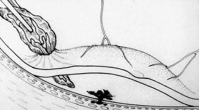 We use positive action horizontal forceps that are angled 130° and have tips 3.2 mm in length.15 The tips are introduced (closed) through the retinotomy, which has usually enlarged slightly during the subretinal manipulation. The objective is to place the opened blades around the stalk or the adhesion, with the membrane in front of the blades. Gentle traction with the blades held closed breaks the connection (Fig. 5). This step is performed slowly and carefully. If traction on the retina is seen, the membrane is released and further separation of the complex from neurosensory retina is accomplished. If excessive tugging and displacement of surrounding RPE is seen, then consideration is given to using the subretinal scissors to cut the stalk rather than breaking it with the forceps. In virtually every case, the membrane (and often the adjacent laser scar) can be removed in one piece. As pathologic examination has confirmed, the abundance of cohesive basement membrane material matrix surrounding occasional capillaries, creates a complex of significant tensile strength.14