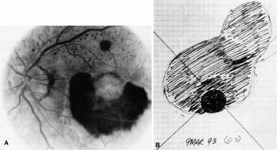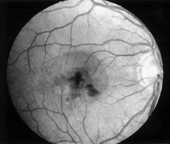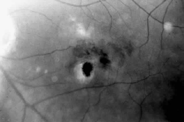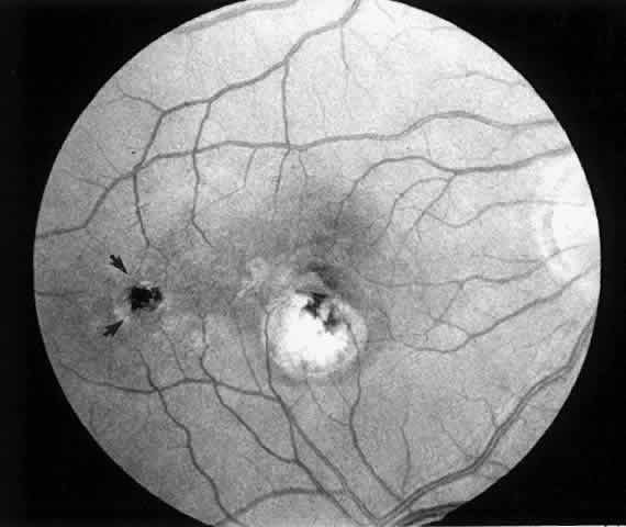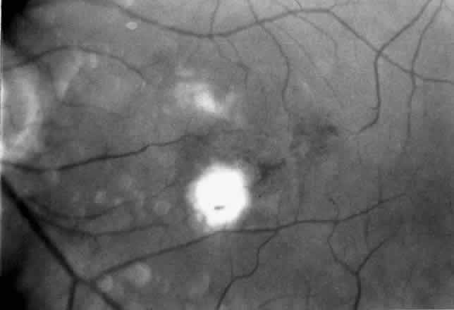 Patients are examined 1 and 7 to 10 days after surgery to verify that intraocular pressure is acceptable, the retina remains attached, and no infection occurs. Three weeks after surgery, the view is usually adequate for assessment of the presence or absence of subfoveal RPE. Occasionally, residual subretinal blood will obscure the underlying tissues for a longer period of time. Within the first month, angiography is repeated to evaluate for recurrence of neovascularization. Not uncommonly, the site of the original choroidal ingrowth stalk demonstrates recurrent neovascularization. Often this site is not subfoveal and therefore slit lamp laser photocoagulation can be employed to ablate the recurrence. Given the fact that membranes recur in approximately one third of cases within 6 months, close follow-up is essential. |
