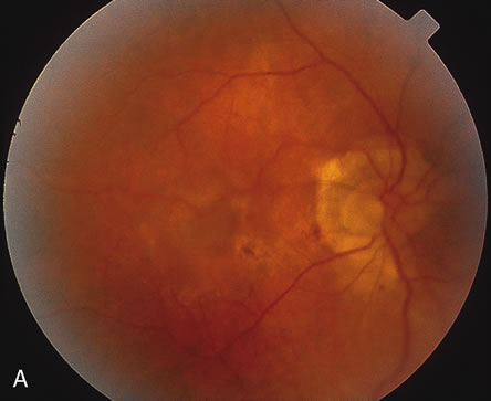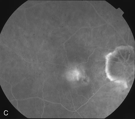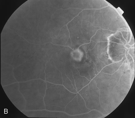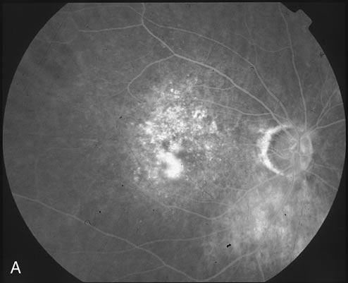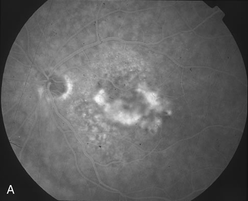 to ocular histoplasmosis syndrome (OHS). Fluorescein film angiography