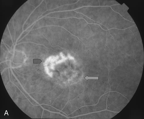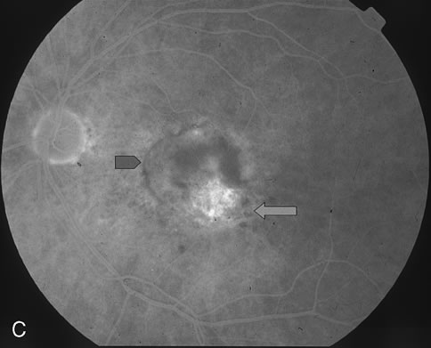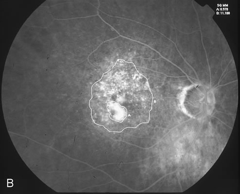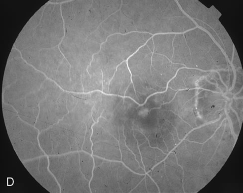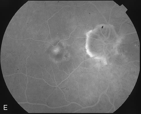 to reinduce or maintain occlusion within CNV. The ideal light energy dose, or fluence, to safely treat CNV was modeled on primate and early-phase studies that varied the parameters of laser irradiance, fluence, and treatment duration.8 Preliminary clinical studies demonstrated untoward effects of retinal vascular closure when a light energy dose of 150 J/cm2 was administered.20 This led to the recommendation in the phase III prospective clinical trials for PDT treatment at 50 J/cm2. Repetition of PDT treatment every 12 weeks was allowed if recurrent CNV leakage was present on fluorescein angiography and examination.21–23 The irradiance of 600 mW/cm2 used for PDT is markedly less than that used for thermal laser photocoagulation (which is typically in the range of 100 to 1000 W/cm2).8 Figures 1D and E demonstrate the typical CNV hypoperfusion on fluorescein angiogram noted at 4 weeks status-post PDT with verteporfin for predominantly classic CNV in AMD (Fig. 1A to C).