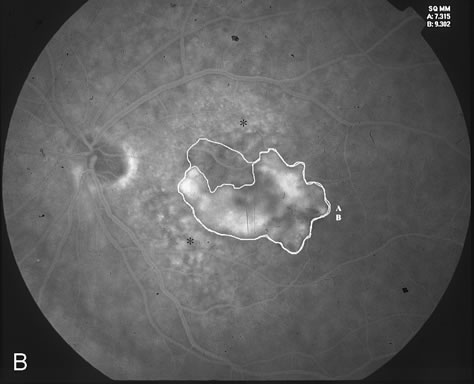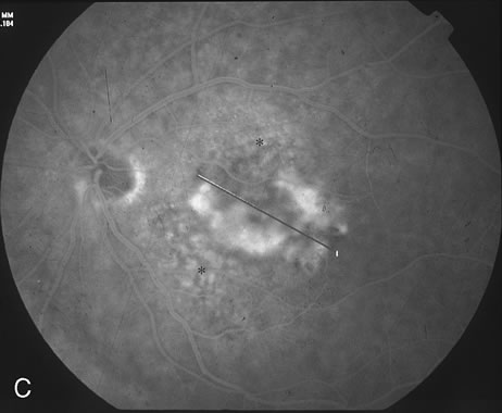 The classic and occult components of CNV are outlined in Figure 2. The percent of the CNV that is classic can then be determined as a proportion of the total CNV. In Figure 2A and B, the area of classic CNV measures 978 square microns and the total lesion measures 11,180 square microns. The classic component is thus 9% of the entire CNV and this lesion is classified as “minimally classic” CNV (defined as less than 50% classic CNV).23,40 The fluorescein angiogram demonstrates another mixed classic and occult CNV lesion in Figure 3. Using digital area measurements, the lesion in Figures 3A and B is composed of 79% classic CNV and fulfils the criteria for predominantly classic, subfoveal CNV that may benefit from verteporfin-PDT based on TAP findings.23,40 The TAP studies also demonstrated a visual benefit in eyes that had prior nonfoveal, thermal laser photocoagulation and subsequent recurrence of CNV below the fovea.23,40 In Figure 4A, subfoveal CNV recurrence in an eye with prior thermal photocoagulation is demonstrated. One month following verteporfin-PDT treatment, Figures 4B (early phase) and 4C (late phase) demonstrate characteristic hypofluorescence of the treated subfoveal CNV on fluorescein angiography. After qualifying for verteporfin-PDT based on clinical and fluorescein angiographic findings, informed consent is carefully obtained. Contraindications to PDT include porphyria, severe liver disease, pregnancy, or a known hypersensitivity to a photosensitizing agent. The greatest linear dimension (GLD) is determined with caliper measurement across the longest digital fluorescein angiographic diameter of leakage. The size of the area to be treated using the nonthermal 689 nm light should have a 500 μm border around the CNV, so a total of 1,000 μm should be added to the greatest diameter (or GLD) of CNV. The treatment area should extend no closer than 200 μm to the optic nerve, as recommended by the TAP studies.23,40 In Figure 3C, the area of CNV to be treated would be 4,184 plus 1,000 μm, or 5,184 microns. Verteporfin, which is stored as a dry powder, is reconstituted with sterile water and diluted with 5% dextrose solution immediately before use. This solution is infused intravenously over 10 minutes, preferably through a large cubital or cephalic vein. Constant monitoring during the entire infusion is imperative to avoid photosensitizer extravasation, which can have serious dermatological consequences. The calculated dose of verteporfin is 6.0 mg/m2 body surface area; thus, the accurate weight of the patient should be obtained before treatment. The 689-nm diode laser light treatment begins 15 minutes after commencing the verteporfin infusion. The laser treatment is delivered at the slit lamp through a diode-coated contact lens. Laser treatment is applied for 83 seconds, which produces a total energy dose of 50 J/cm2. In the scenario of a patient presenting with subfoveal CNV lesions in both eyes qualifying for verteporfin-PDT, guidelines have been outlined for concurrent bilateral treatment (see package insert provided by Visudyne, Novartis Ophthalmics). This technique consists of injecting an identical dose of verteporfin (6.0 mg/m2) as when treating only one eye. The CNV that appears more aggressive should be treated first at the standard 15-minute post-injection time. Immediately following the conclusion of light application in the first eye, laser settings should be adjusted to introduce the correct treatment-size parameter for the CNV in the fellow eye. Treatment for the fellow eye should commence no later than 20 minutes after commencement of verteporfin infusion. This technique is not recommended for the initial PDT treatment in patients with bilateral, eligible CNV lesions. In this case, unilateral verteporfin-PDT should be administered with follow-up in one week for treatment of the fellow eye. This can identify any safety issues that may arise from PDT. Once the fellow eye is treated, following treatments at the three-month interval can be administered concurrently if evidence of leakage is present in both eyes. Post-treatment precautions include avoidance of direct sunlight or bright indoor lights. A wide-brimmed hat, gloves, long pants, long sleeves, and protection of the eyes and face from direct sunlight are required for travel immediately after PDT. Complete avoidance of direct sunlight is strictly prescribed for 5 days following verteporfin-PDT. This is to prevent potentially serious skin burns and photosensitivity that may occur from residual, circulating photosensitizer after PDT. |