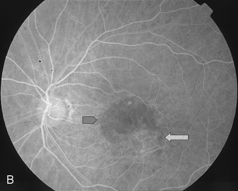within a few days following treatment.15–17 This corresponds to the vascular occlusion noted in animal studies.3,4 The fluorescein hypofluorescence is a result of transient, choroidal hypoperfusion, which
