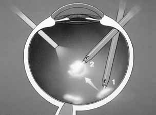 Removal of cortical material from the vitreous is easy. Most pieces are readily aspirated into the vitreous cutter. Larger, denser fragments can be removed by gently “stuffing” the material into the cutter opening with the light pipe. It is imperative to remember that most of the vitreous should be removed before manipulation of larger lens fragments to limit any vitreal-retinal traction and subsequent retinal tears. Larger nuclear pieces, if sufficiently soft, can also be removed with the vitreous cutter. More commonly, the phacofragmenter is needed to remove nuclear material. The technique typically involves gentle aspiration with the phacofragmenter tip to lift the piece into the midvitreous cavity (Fig. 5). A light pipe, especially one with a spatulated extension, can be used to stabilize the fragment. Ultrasound is then initiated to remove the piece. Not uncommonly, the lens piece will disengage from the fragmentation tip. We have found that lower energy or energy set in the pulse mode is beneficial in these circumstances. Higher aspiration rates are also helpful in prevent lens fragment from becoming disengaged from the fragmentation tip and falling onto the retina.