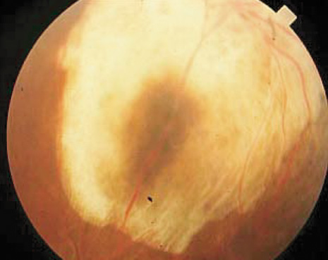 Another method of radiotherapy is charged particle irradiation.39–42 This technique provides a focused beam of radiotherapy to the region of the tumor from an external source. A recent report showed that the 5- and 10-year rates of regrowth were 3% and 4%, respectively.41 Among the 45 documented recurrences, about one-half occurred at the margin, presumably to because of treatment planning errors. Recurrence of the tumor was independently related to risk of tumor-related death. Similar to plaque radiotherapy, radiation complications in the eye and adnexa can occur.43 Tumor control with charged particle and plaque radiotherapy are similar. Plaque radiotherapy combined with thermotherapy provided excellent tumor in 270 studied patients with only 3% recurrence at 8 years (Figs. 4 and 5). 44 The high control rate of 97% was maintained for eyes with juxtapapillary choroidal melanoma despite the fact that this location is difficult for plaque placement.44 Studies have shown that 5% to 10% of patients treated with radiotherapy ultimately require enucleation of the affected eye because of tumor recurrence or radiation complications.45,46