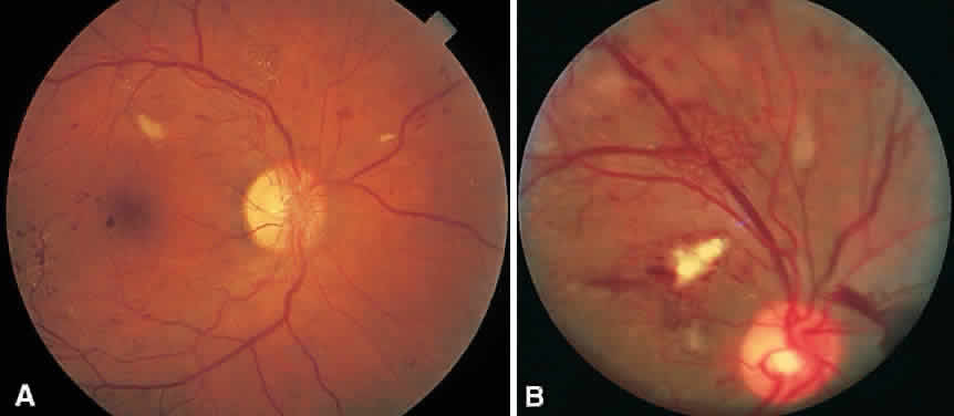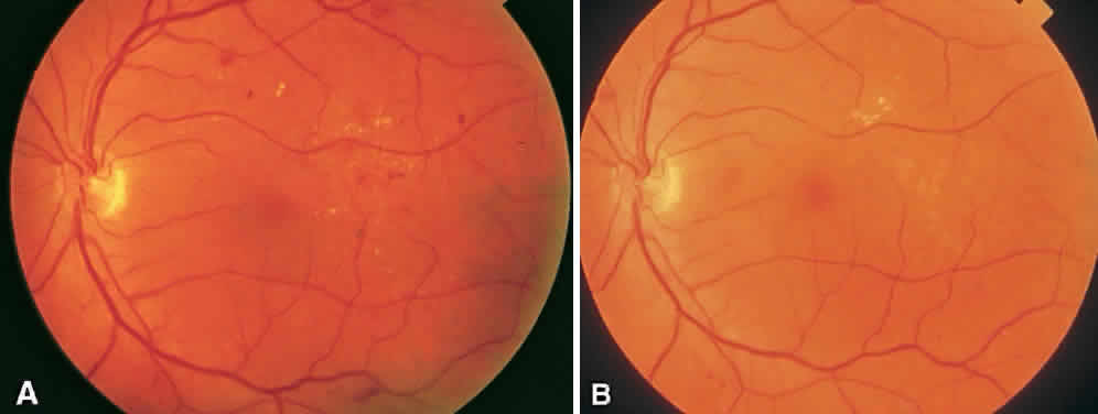 The Central Vein Occlusion Study (CVOS) was a prospective, randomized, multicenter clinical trial designed to evaluate the role of PRP in promoting regression of anterior segment neovascularization resulting from ischemic CRVO, to determine the efficacy of macular grid laser photocoagulation for treating CRVO-related macular edema associated with visual acuity of 20/50 or worse, and to define the natural history of CRVO.53 The CVOS demonstrated that, although prophylactic PRP does decrease the risk of developing anterior segment neovascularization, prompt regression of neovascularization was more likely in eyes that had not received prior laser photocoagulation.54 Therefore, the study recommends observing ischemic CRVOs closely and treating with PRP at the first sign of iris or angle neovascularization rather than treating prophylactically. PRP may be warranted in the setting of acute ischemic CRVO if there is a high likelihood of poor patient compliance with follow-up. Unlike the BVOS, the CVOS did not demonstrate any benefit to laser photocoagulation for macular edema.55 Although laser therapy did decrease the amount of leakage on FA, there was no difference in visual acuity between treated and untreated eyes at any point in follow-up. An innovative treatment for nonischemic CRVO has previously been described.56 By using lasers to create an anastomotic connection between a retinal and a choroidal vein, a bypass to the obstruction can be created. Modifications to the initial technique have improved the rate of successful creation of chorioretinal anastomosis to 54%.57 Of the patients with a functioning anastomosis, 84% had visual improvement with an average improvement of 4.3 lines. BVOs may also benefit from such therapeutic intervention.58 The principle complication of this technique is the development of neovascularization, which can be subretinal, intraretinal or intravitreal. A pilot study using transscleral diode laser to create a chorioretinal anastomosis is under way. All patients with a CRVO should be examined at monthly intervals for the first 6 months. Particular attention should be given to anterior segment structures such as the iris, especially the pupillary margin, and the anterior chamber angle, with the practitioner looking specifically for neovascularization. Thus, an undilated examination of the anterior segment including gonioscopy is essential in following these patients. This close follow-up is especially important in eyes with symptoms of less than 1 month's duration, initial visual acuity less than 20/200, numerous intraretinal hemorrhages, and extensive capillary nonperfusion because these eyes have a much higher risk of developing anterior segment neovascularization.59,60 |