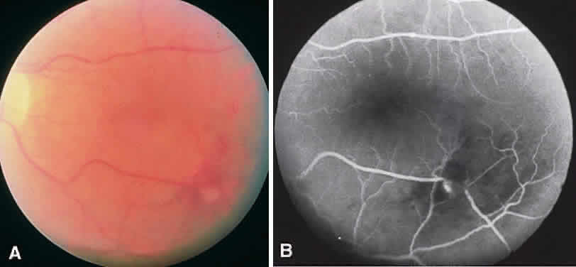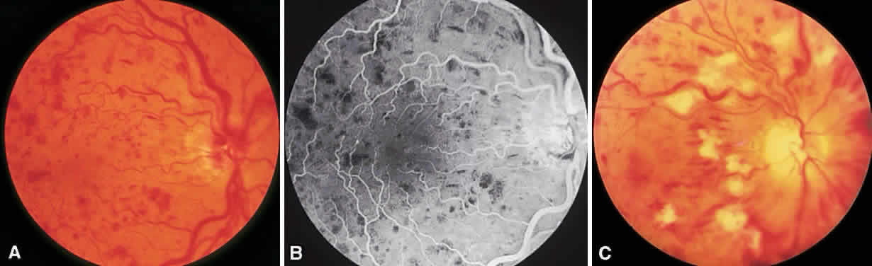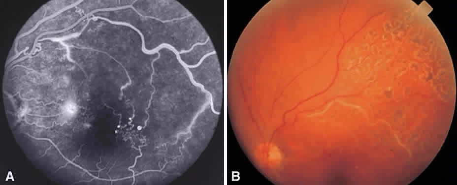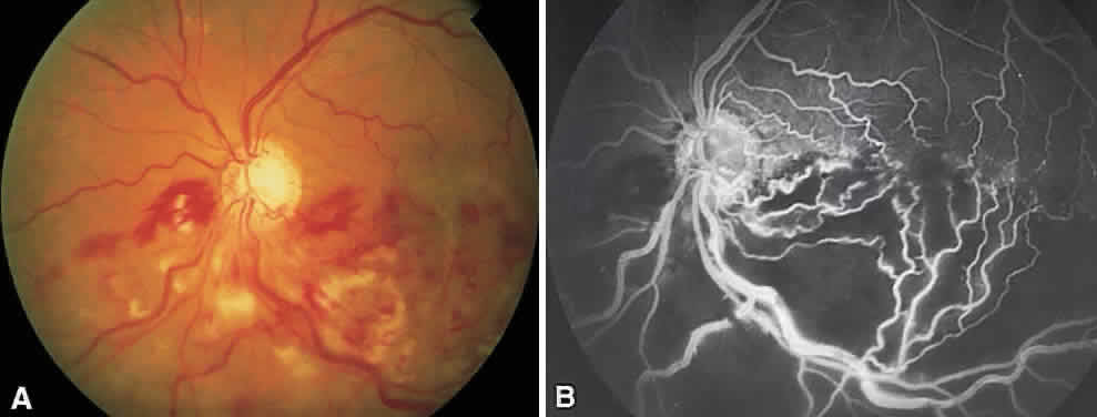 If, after 3 months, visual acuity is 20/40 or worse, laser treatment is indicated. Grid treatment with a spot size of 100 to 200 μm and 0.1-second duration is placed in areas of leakage as shown on FA. There should be sufficient clearing of retinal hemorrhage before FA or laser because visual acuity may increase and FA may be more useful in terms of evaluating the macula for evidence of capillary nonperfusion. Recommendations concerning intensity of burns, spacing between laser burns, and treating near the fovea as well as potential complications are similar to those for laser treatment of DME. Eyes are reevaluated in 4 months and retreated if persistent macular edema accounts for the decrease in visual acuity. The BVOS also assessed the role of scatter photocoagulation in preventing formation of retinal neovascularization and subsequent vitreous hemorrhage in patients with ischemic occlusions.47 It was noted that scatter argon laser photocoagulation to the affected segments, as determined by color photography and FA, extending no closer than two disc diameters to the center of the fovea, significantly decreased the risk of developing retinal neovascularization and lessened the occurrence of vitreous hemorrhage. Eyes at greatest risk for the development of retinal neovascularization were those with ischemic branch vein occlusions defined as eyes having more than five disc areas of capillary nonperfusion on FA. The risk of hemorrhage impairing vision in untreated patients is fairly low, however, and as a result no difference was found in terms of final visual acuity between treated and untreated groups. The study therefore recommends that scatter laser treatment be deferred until retinal neovascularization is present. The methods, as well as risks, of treatment are similar to those relating to PRP in patients with diabetes, except that treatment is limited to the affected area. CENTRAL RETINAL VEIN OCCLUSION Central retinal vein occlusions (CRVOs) are caused by thrombosis formation within the vein at the level of the lamina cribrosa. Clinical findings in the setting of a CRVO include intraretinal hemorrhages in all four quadrants, increased dilation and tortuosity of the retinal veins, macular edema, nerve fiber layer infarcts, and disc edema. Acutely, the decrease in visual acuity is secondary to macular changes such as macular edema, hemorrhage and capillary nonperfusion. Long-term visual loss may be secondary to macular capillary nonperfusion, chronic macular edema, arteriole occlusion, tractional or exudative retinal detachment and neovascular glaucoma.48,49 Anterior segment neovascularization is much more common with CRVOs than BRVOs. CRVOs are usually described as “ischemic” or “nonischemic” based on clinical examination and FA findings (Fig. 6). Roughly 75% to 80% of CRVOs are nonischemic. However, up to 34% of these will progress to the ischemic type usually within 1 year.46,47,50,51 An eye with a nonischemic CRVO typically has minimal capillary nonperfusion on FA, relatively few intraretinal hemorrhages, and a better visual prognosis than the ischemic variety. Ischemic CRVOs, conversely, have widespread capillary nonperfusion and are associated with a worse visual prognosis with increased risk of rubeosis iridis and neovascular glaucoma.52