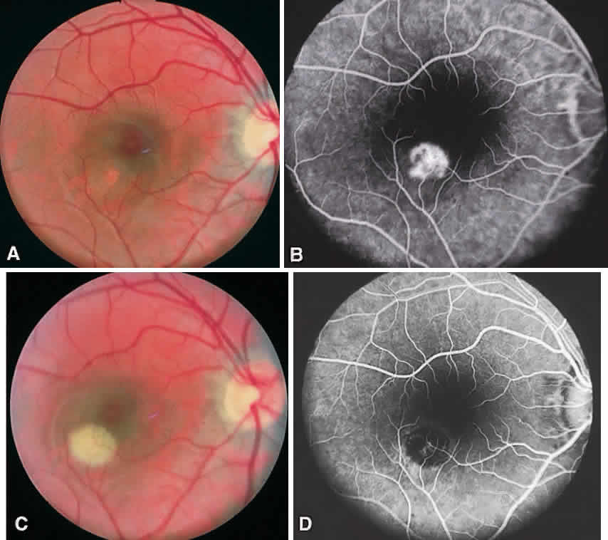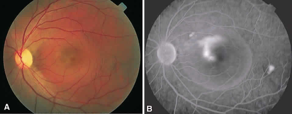 MACULAR DEGENERATION In the United States, age-related macular degeneration (AMD) is the most common cause of severe visual loss in people older than 65 years of age. Most patients with AMD who suffer severe vision loss have CNV.113 AMD-related CNV tends to be a bilateral disorder and, over 5 years, CNV develops in nearly 60% of fellow eyes that were initially free of neovascularization.114 CNV represents new and abnormal blood vessel growth either between the RPE and Bruch's membrane or in the subretinal space. Typically patients with CNV present complaining of blurred or distorted vision and, on examination, are found to have evidence of neovascularization such as subretinal fluid, hemorrhage, or exudation. In cases where CNV is apparent or suspected, FA alone or combined with indocyanine green angiography should be performed (Fig. 8). The results of these studies help determine treatment options that include observation, laser photocoagulation, photodynamic therapy (PDT), transpupillary thermotherapy (TTT), laser prophylaxis, and dye-enhanced laser treatment. The Macular Photocoagulation Study (MPS) was a randomized, prospective multicenter clinical trial that documented that laser photocoagulation was preferable to observation in the management of select patients with well-defined CNV from AMD, ocular histoplasmosis, and idiopathic causes.115–118 Unfortunately, using the MPS criteria, only 15% of patients with AMD-related CNV are eligible for laser treatment and one half of these are subfoveal on presentation. Of nonsubfoveal membranes treated with laser, over 50% recur, usually on the foveal side of treatment. Recurrence of CNV is associated with a poor visual prognosis.119 In the MPS, the major outcome variable, severe visual loss, was defined as a loss of six or more lines from initial or baseline visual acuity. The MPS categorized CNV based on its location relative to the center of the foveal avascular zone as depicted by FA. Extrafoveal lesions are CNV200 μm or more from the center of the foveal avas-cular zone, whereas juxtafoveal lesions are between1 and 199 μm from the center. Subfoveal membranesextend through or underneath the foveola. For ex-trafoveal CNV related to AMD, severe vision loss occurred in 64% of untreated eyes versus 46% of treated eyes after 5 years of follow-up.115 Fifty-four percent of treated eyes developed recurrent CNV, which was typically subfoveal. For juxtafoveal lesions, severe vision loss after 5 years was noted in 65% of untreated eyes versus 55% of treated eyes.116 As in the extrafoveal group, the major cause of vision loss was persistent and recurrent CNV. The MPS has demonstrated a treatment benefit of laser treatment over observation for subfoveal recurrent CNV.118 Although occult CNV may benefit from lasers in certain circumstances, in the MPS the treatment benefit was greatest for eyes that had only classic CNV.120,121 Later, the MPS evaluated laser treatment for subfoveal CNV in the subfoveal118 and subfoveal recurrence122 studies. Both studies reported a treatment benefit, but only if the CNV was relatively small. The MPS also evaluated laser treatment of idiopathic CNV and CNV related to ocular histoplasmosis. Outcomes in both groups were better than for AMD-related CNV with a decreased incidence of severe visual loss and fewer recurrences.123,124 METHODS Recognizing that CNV can grow at the rate of70 μm/day,125 the MPS recommends projection of a FA no more than 72 hours old to guide laser treatment. This helps ensure complete treatment of the CNV. There is a higher rate of recurrence if theinitial treatment fails to completely cover the CNV.126Although topical anesthesia usually suffices, if the patient cannot fixate with the fellow eye or if there is too much eye movement, retrobulbar anesthesia is indicated. A test burn is usually given in a safe location to determine the appropriate power setting. We typically begin with a 200-μm spot size, 200-mW power, and 0.2- to 0.5-second duration. The perimeter of the lesion is outlined first with overlapping burns with treatment extending 100 μm beyond the CNV. Then, the center is treated. Burns should be heavy, white, and confluent.122,124 There appears to be no difference between argon green and krypton red wavelengths in terms of final outcomes.118 The dye yellow laser is also effective. A posttreatment FA is obtained 2 to 3 weeks later. Persistent or recurrent CNV can be managed according to the clinical and angiographic findings. NEW TREATMENT MODALITIES Although laser photocoagulation of AMD-related CNV is useful in selected situations, most patients with CNV are not candidates for conventional treatment. Because of these limitations, new treatment modalities are under investigation. One of these, PDT, is currently being used in the management of subfoveal CNV.127–132 Unlike conventional laser treatment that results in the thermal destruction of normal as well as abnormal tissues, PDT uses nonthermal laser light to activate a photosensitizing agent that initiates a free radical cascade resulting in selective occlusion of the CNV without damaging the overlying neurosensory retina. This selective tissue destruction with PDT is achieved by sequestration of the photosensitizer in the target tissue, which is then irradiated with low energy light. The photosensitizing dye is injected intravenously 15 minutes before laser treatment using the diode laser. A subthreshold treatment is delivered such that the treating ophthalmologist cannot appreciate a change in the clinical appearance of the patient's fundus. Several photosensitizing agents are under investigation including verteporfin (Visudyne), tin ethyl etiopurpurin (SnET2/Purlytin), and luteium texaphyrin (Lu-Tex). The Treatment of Age-Related Macular Degeneration with Photodynamic Therapy (TAP) Study is using verteporfin as the photosensitizing agent. The 12-month data from this study, which is being conducted in 609 patients at 22 ce