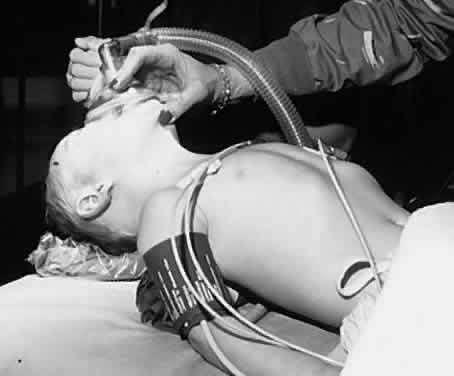 INDUCTION Induction of anesthesia may be through a mask with a potent inhalational agent (halothane, sevoflurane). A pleasant flavor may be applied to the mask with Chapstick to make the mask more acceptable to the child. Other induction methods include intravenous administration of 2.5% sodium thiopental (4 to 8 mg/kg), propofol (2 to 3 mg/kg), or rectal administration of methohexital sodium (20 to30 mg/kg). Intramuscular injection of ketamine (1 to 8 mg/kg) may facilitate induction but nystagmus is common and may make ocular surgery difficult. Light levels of anesthesia may produce poor operating conditions. Bradycardia with or without hypotension may occur during inhalation induction with halothane and is caused by the cardiac effect of halothane. This is less common with sevoflurane than halothane. Bradycardia is treated by administering atropine (10 to 20 μg/kg), intravenous fluids, intravenous calcium, or epinephrine, and discontinuing the anesthetic agent. Because intravenous medication can facilitate securing the airway and establishing cardiovascular stability, an intravenous catheter should be placed as soon as possible after the child is asleep. In children, veins in the lower extremities or scalp may be used in addition to those in the upper extremities. Intramuscular injection of ketamine is usually reserved for uncooperative children who have not been sedated adequately by premedication withmidazolam or for older children (15 to 20 years) who are unable to control themselves in the operating room setting (e.g., the severely mentally handicapped). Low-dose ketamine (1 to 3 mg/kg IM) may quiet the child sufficiently to accept intravenous or mask induction. Complications of intramuscular ketamine include a possible increase in intraocular pressure (IOP), increased secretions, loss of airway reflexes, airway obstruction, and postoperative hallucinations. Anticholinergic should be administered with ketamine to decrease secretions. INTUBATION Some surgical procedures can be performed without an endotracheal tube in place, such as examination under anesthesia or probe and irrigation of the nasolacrimal duct, especially if the procedure is brief (less than 5 minutes; Figs. 4 and 5). However, intubation with a properly sized endotracheal tube is a routine part of most procedures involving anesthetics, especially in younger patients undergoing surgery on the face, and this can be safely performed even for brief procedures. Intubation should be performed when the child is deeply anesthetized and has little muscular tone. Neuromuscular blocking drugs are optional. Common complications ofmask anesthesia include airway obstruction, laryngospasm, silent aspiration, and hypotension from deep anesthesia. Protecting the airway with a properly sized endotracheal tube can prevent most of these problems.
