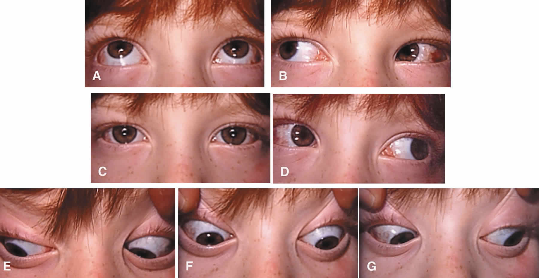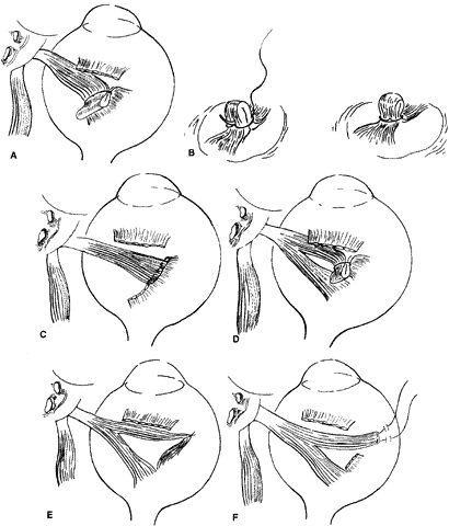 position. INDICATIONS: BROWN'S SYNDROME Brown's syndrome is a well-defined clinical disorder with several possible etiologies that can be either congenital or acquired.65–68 Brown's syndrome is characterized by limitation of elevation of the affected eye, particularly in adduction, typically caused by abnormalities of the trochlea and superior oblique tendon. Although elevation is typically normal or near normal in abduction, there is a characteristic “down shoot” of the affected eye when directed from primary position into adduction. Forced ductions are abnormal and usually characterized by an abrupt, absolute limitation of elevation in adduction. The elevation deficiency is made worse by retropulsion of the globe into the orbit. To ensure proper treatment, Brown's syndrome must be distinguished from other forms of monocular elevation deficiency such as superior rectus muscle palsy (sometimes called “double elevator palsy”), primary inferior rectus muscle fibrosis, inferior oblique muscle palsy (exceedingly rare), and pseudo-Brown's syndrome secondary to an orbital floor fracture or other causes of orbital restriction.69–71 Although stripping of the superior oblique tendon “sheath” has been advocated in the past, this surgical approach undoubtedly arose from a misunderstanding of the pathophysiology of this disorder. Most patients with congenital Brown's syndrome appear to have an intrinsic abnormality of the trochlea or proximal tendon limiting movement through a nonyielding trochlear tunnel.66 A few cases may be caused by abnormal leashes or bands extending from the trochlea to the globe, similarly limiting elevation of the eye.72 Other theories have also been proposed.7,65,73,74 Regardless of cause, effective treatment usually requires severing the superior oblique tendon between the trochlea and scleral insertion either by tenotomy or tenectomy. Most patients who require corrective surgery have congenital Brown's syndrome. Acute onset Brown's syndrome is usually inflammatory or posttraumatic in etiology and may improve or resolve spontaneously. Congenital Brown's syndrome or chronic acquired Brown's syndrome that does not respond to steroids or other appropriate treatment may be treated surgically. The most common indication for surgical correction is a chin-up head posture or face turn away from the affected eye. This usually allows the patient to achieve fusion. Additional surgical indications include pain (typically over the trochlea), diplopia, and cosmetic disfigurement. It is not uncommon for parents of children with Brown's syndrome to believe the problem resides in the normal fellow eye, which appears to elevate excessively on attempted up gaze. Surgery is appropriate for patients with moderate-to-severe involvement, providing there is no reasonable expectation of spontaneous improvement. INDICATIONS: A-PATTERN STRABISMUS A-pattern strabismus is characterized by greater esotropia (or less exotropia) in up gaze and greater exotropia (or less esotropia) in down gaze. Although the difference can be as little as 10 PD, it is often much greater in magnitude, sometimes exceeding 100 PD in extreme down gaze. When a large A-pattern is associated with superior oblique muscle overaction, superior oblique muscle weakening is usually indicated. In most cases, the procedure of choice is bilateral superior oblique tendon tenotomy. Patients undergoing this operation should have unequivocal overaction of both superior oblique muscles. This finding is typically accompanied by a right hypertropia in right lateral gaze and a left hypertropia in left lateral gaze. Inferior oblique muscle underaction should be present and is associated with tight (but not restricted) superior oblique muscles on forced duction testing. If any doubt exists, objective incyclotropia on fundus examination is a useful way of confirming the presence of true superior oblique muscle overaction.75 Double Maddox rod testing may occasionally help document the presence of incyclotropia. Because bilateral superior oblique tendon tenotomy is a powerful operation, it is rarely appropriate when there are less than 40 PD of A-pattern or λ-pattern and should be avoided in the absence of inferior oblique muscle under action. Although a few patients undergo superior oblique tendon tenotomies as an isolated procedure, most also require surgery on one or more horizontal rectus muscles. It is therefore imperative that primary gaze position alignment be measured carefully, without the patient assuming a chin-up or chin-down head posture. Disregarding the patient's head position can lead to serious mismeasurement of the horizontal deviation. Patients with asymmetric superior oblique muscle overaction often have a manifest vertical deviation in primary gaze position. In these cases, differential or even unilateral superior oblique muscle weakening may be indicated. Symmetric superior oblique weakening rarely corrects fully the primary gaze position hypertropia and leaves residual oblique muscle dysfunction postoperatively. The vertical deviation usually represents a “spillover” of the hypotropia of the more overacting superior oblique muscle into primary gaze position. If an esotropia is also present, measurements should be obtained with each eye fixating in primary gaze to confirm that the hypertropia does not reverse, which would indicate the need for bilateral surgery. Asymmetric superior oblique muscle weakening can be accomplished using various techniques. As a general rule, the more extensive the dissection of the intermuscular septum surrounding the superior oblique tendon or the closer to the trochlea the tenotomy is performed, the greater the weakening effect will be. Tenotomy and tenectomy at the medial border of the superior rectus muscle are the most powerful operations. Less effective are tenotomy at the scleral insertion (disinsertion), recession or other tendon lengthening procedures, and posterior fibe