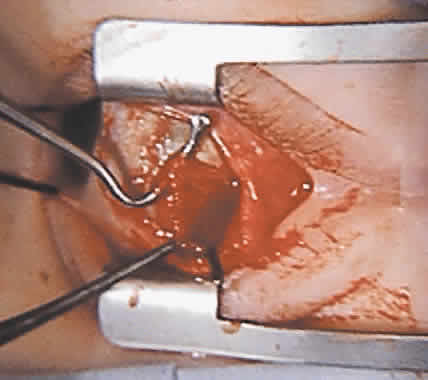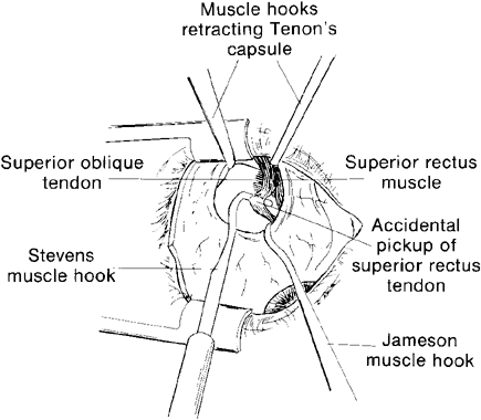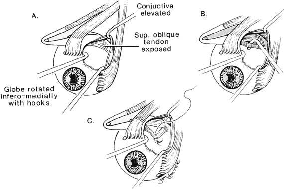 SURGICAL PROCEDURES Free Tenotomy The surgical approach to the superior oblique tendon has already been described. When operating for Brown's syndrome, it is imperative that forced ductions be performed at the beginning of the procedure to confirm the diagnosis. Using a toothed forceps, the eye is grasped at the 6-o'clock position near the corneoscleral limbus and an attempt is made to elevate the globe in adduction. The nonyielding superior oblique tendon can easily be palpated in restricting upward movement of the globe. Exaggerated traction testing is usually not necessary.47 Elevation is normal or nearly normal in abduction. Proptosing the globe forward improves passive ductions, whereas retropulsion into the orbit exacerbates the duction limitation. Unless the superior oblique tendon is going to be recessed rather than tenotomized, a superior nasal surgical approach is technically the easiest. This allows the surgeon to engage the tendon where it is most anterior and cordlike and avoids the possibility of missing posterior fibers near the fanned out insertion, which will result in surgical failure. A temporal conjunctival incision can also be used to approach the tendon medial to the superior rectus muscle as described by Parks and Parker.46 Using this approach, the surrounding Tenon's fascia and intermuscular septum can be left nearly intact, which may limit retraction of the proximal end of the tendon. This is particularly desirable when a less powerful surgical effect is required. Regardless of the site of conjunctival incision medial or temporal to the superior rectus muscle insertion, the superior oblique tendon is engaged on a muscle hook under direct visualization as it passes under the medial border of the superior rectus muscle and bends upward toward the trochlea. Although the tendon is located only several millimeters posterior to the superior rectus muscle insertion with the eye in primary gaze position, it slides posteriorly as the eye is rotated downward. If not readily identified, a limited dissection should be performed along the medial border of the superior rectus muscle. Removing the eyelid speculum and substituting a small retractor may be helpful in gaining surgical exposure. The tendon is engaged on a Stevens' tenotomy hook and verified by palpating over the trochlea. Redundant Tenon's fascia is carefully unloaded from the muscle hook, but extensive dissection should be avoided. The tendon is then cut and the free ends released into the orbit. Forced ductions are immediately repeated. Free movement of the eye confirms that complete transection of the tendon has been accomplished. However, it is not uncommon for forced ductions to improve temporarily before actual tendon transection because of intraoperative manipulation of the globe. This may be interpreted erroneously as a negative traction test result after incomplete tendon tenotomy and yield an unwelcome postoperative surprise when the Brown's syndrome or superior oblique muscle overaction returns immediately after surgery. When performing tenotomy for A-pattern strabismus, the surgical procedure is identical to that previously described for Brown's syndrome, although technically easier in the presence of a normal superior oblique tendon. The conjunctival incision can be made either medial or lateral to the superior rectus muscle. A lateral incision minimizes disruption of the intermuscular septum although identification of the tendon is more direct when approached medially (Figs. 14 and 15). Scleral Disinsertion The superior oblique tendon can also be disinserted from the sclera under the lateral border of the superior rectus muscle. The weakening effect is limited by fascial attachments of the superior oblique tendon to the undersurface of the superior rectus muscle. Therefore, superior oblique tendon disinsertion usually results in less overall weakening of the superior oblique muscle function than superior oblique tendon tenotomy medial to the superior rectus muscle. In addition, near its insertion, the tendon fans out across the sclera and may be difficult to identify, especially for the inexperienced surgeon. Tenectomy Superior oblique tendon tenectomy is performed in a similar fashion to superior oblique tenotomy, except that a 5- or 6-mm section of the reflected tendon is totally excised. Although perhaps more powerful in effect, it is not clear whether this operation has any advantage over tenotomy, even in cases of severe Brown's syndrome or A-pattern strabismus, and precludes surgical reanastomosis later on. Because of the additional fascial disruption, tenectomy probably increases the risk of producing iatrogenic superior oblique muscle palsy postoperatively.79 Posterior Tenectomy/Tenotomy Tenotomy or disinsertion that is limited to the posterior superior oblique tendon fibers (leaving the anterior fibers intact) has been performed by some surgeons as an alternative to free tenotomy (Fig. 16).92,93 Although this procedure may be used to collapse a small or moderate A-pattern, it appears to be less effective in correcting the superior oblique muscle overaction seen on version testing. However, it is extremely useful as a minimal weakening procedure when superior oblique muscle overaction is mild, asymmetric, or in the context of a dissociated strabismus. One study showed that bilateral posterior tenotomy performed for Apattern strabismus resulted in a mean reduction of the A-pattern of 22 PD.94 Unilateral posterior tenect- omy was also shown to reduce hypotropia (in patients with unilateral superior oblique over action) by a mean of 7 PD. Posterior tenectomy or tenotomy is occasionally used to treat Brown's syndrome patients who are marginal surgical candidates with less than 5 PD of primary position hypotropia. Preserving the primarily torsional, anterior fibers of the superior oblique tendon may reduce the risk of postoperative torsional diplopia in patients with bifoveal fixation. Recession Su