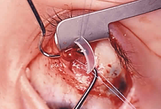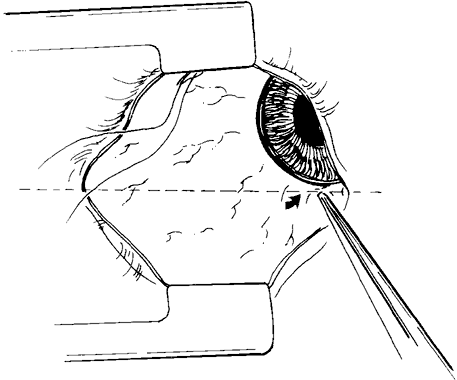 After the superior oblique tendon has been positively identified, it is gathered on a Stevens tenotomy or other muscle hook with a small tip. This maneuver is most readily accomplished by passing the hook over the tendon with its tip parallel to the sclera and pointed medially. Direct visualization of the tendon is essential, in that blind sweeping can be hazardous. A superior temporal vortex vein usually exists near the posterior insertion of the superior oblique tendon and the optic nerve is within reach. In addition, it is important to avoid passing the muscle hook into orbital fat because its release into the sub-Tenon's space predisposes the eye to develop an adherence syndrome postoperatively.50 The superior oblique tendon is drawn forward through the surgical wound and attachments to Tenon's fascia and the superior rectus muscle are cut. A second pass of the muscle hook helps ensure that no fibers have been missed. Gross assessment of tendon laxity is then performed. A lax tendon requires a greater amount of tuck, whereas a normal tendon should be approached with caution, and a taut tendon should not be shortened at all. A Bishop tendon tucker is helpful to control the isolated tendon and permits the surgeon to quantitate the amount of tendon shortening conveniently. The tendon is drawn in the tucker until snug, but not tight. The loop of tendon is then sewn to itself using a nonabsorbable suture such as 5-0 braided Dacron. After this provisional tuck has been completed, the tendon is released into the orbit and a traction test is performed with the eye positioned in maximum adduction. It has been our experience that the ideal tuck results when the amount of tendon shortening produces its first resistance to elevation as the inferior limbus crosses an imaginary line between the medial and lateral canthus (Fig. 7).34,51 Care must be taken not to retropulse the globe into the orbit, because this exaggerates the duction limitation. An average tendon shortening of approximately 12 mm is required in congenital superior oblique muscle palsy (lax tendon) and 8 mm in acquired palsy (normal tendon). However, the optimum amount of tuck does not necessarily correlate with the size of the hypertropia in primary gaze position and intraoperative titration is essential. If the initial tuck is too tight or too loose based on results of traction testing, the tendon is retrieved from the orbit and the tuck is adjusted. The final tie-off is performed by passing the suture through and around the superior oblique tendon a second time after which it is tied securely. This minimizes the potential for tendon slippage through the tuck and provides additional security should a suture loop fail postoperatively. It is not necessary to sew the redundant tendon to the sclera. Conjunctival closure is performed at the surgeon's discretion. A running suture of 6-0 plain catgut is well tolerated and prevents the conjunctiva from gaping open postoperatively. Tendon Plication/Imbrication This procedure is similar to the superior oblique tendon tuck, except that a nonabsorbable suture is secured to the tendon 6 to 9 mm from its insertion and then passed through the sclera just beyond the insertion. Pulling these sutures tight folds the tendon over onto itself (“imbrication”) and advances the midportion of the tendon.46 Plication shares reversibility with the superior oblique tendon tuck, although it alters the normal anatomic insertion of the tendon and is more difficult to adjust intraoperatively. Tendon Resection/Advancement The superior oblique tendon can be resected or advanced in a manner similar to that used for rectus muscles (see Fig. 2C). However, the long and fanlike tendinous insertion makes this technique more challenging, even with optimal exposure, and typically results in narrowing and some anterior transposition of the scleral insertion. Furthermore, this procedure is less easily reversible than superior oblique tendon tuck and other nondisinsertion procedures. Therefore, superior oblique tendon resection is rarely, if ever, selected by most surgeons. Harada-Ito Procedure The Harada-Ito procedure is usually indicated in patients whose primary complaint is torsional diplopia (Fig. 2E, F and Fig. 8). This is encountered most often in adult patients with bilateral, posttraumatic superior oblique muscle palsy. Patients with congenital superior oblique palsy often have sensory adaptations that partially or completely compensate for years of excyclotropia. Although used primarily to correct symptomatic excyclotropia in patients with little or no vertical deviation in primary gaze position, it may also be effective in the treatment ocular torticollis with tilt-dependent nystagmus.52,53 The Harada-Ito procedure involves selective strengthening of the anterior fibers of the superior oblique tendon that are primarily responsible for incyclotorsion. It can be performed either by disinserting, advancing and anteriorly transposing the anterior tendon fibers (disinsertion technique) as described by Fells54 or by the classic Harada-Ito method, which redirects the anterior fibers as a “dog leg” without scleral disinsertion (Fig. 8).40 We prefer the classic method because it is more easily reversible. However, the disinsertion technique has the advantage of being readily modified for use with adjustable sutures.41,55 Superior oblique tendon tuck limited to the anterior fibers is an occasionally useful alternative when an intermediate amount of incycloduction is desired with some vertical correction. To perform the classic Harata-Ito procedure, the superior oblique tendon is identified and isolated on a muscle hook in a fashion similar to a superior oblique tendon tuck (see previous discussion). A small muscle hook is used to separate between one third and one quarter of the most anterior tendon fibers for approximately 8 to 10 mm from their scleral insertion. A nonabsorbable, double-armed suture, such as 5-0 b