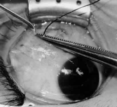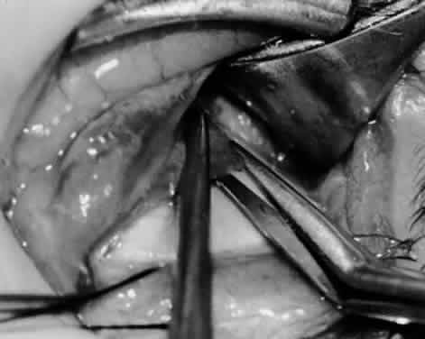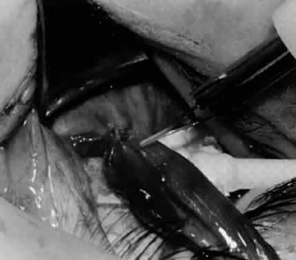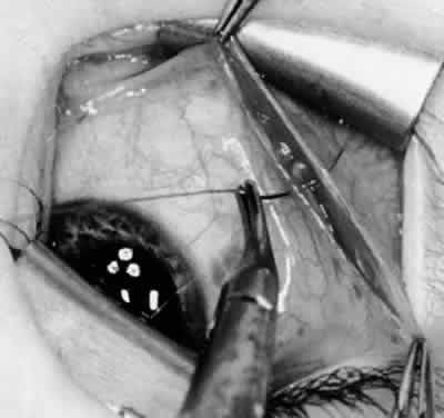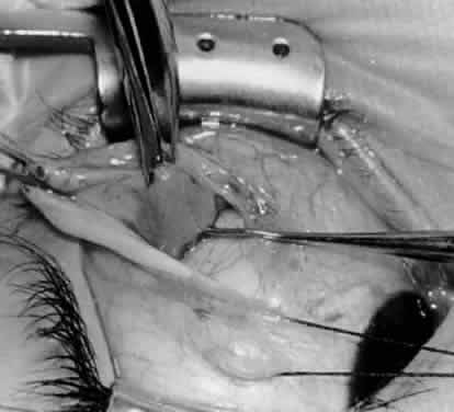 and extirpation, and anterior transposition.10 MYOTOMY An inferior oblique myotomy usually is performed between the nerve to the inferior oblique muscle and the insertion of the muscle. After the muscle is crushed with one or two hemostats, transverse surgical sectioning of the muscle is performed. Suture ligatures or cautery may be used for hemostasis. If the inferior oblique muscle is isolated properly, this procedure is not complicated and is performed rapidly. The severed ends of the inferior oblique muscle tend to reunite, however, and the preoperative state may be resumed within several months.2,10 MYECTOMY An inferior oblique myectomy includes removal of a section of the muscle to reduce the tendency of the myotomized ends to reunite. Two hemostats are used, as with the myotomy, except that a space of 5 mm or more is maintained between the hemostats, so that the segment of muscle between the hemostats can be removed. Cautery, ligature, or both are used for hemostasis. This procedure offers the same advantages as the myectomy but the cut ends still tend to reunite.10 Parks2,11 performed a controlled prospective study comparing the various methods of weakening the inferior oblique muscle. The study included 638 consecutive patients who had a minimum follow-up of 2 years. Parks performed 19 myectomies at the origin of the inferior oblique, 86 myectomies at the insertion, 89 disinsertions, and 444 recessions of inferior oblique muscles. The overaction of the inferior oblique muscle returned in 79% of the 19 eyes that underwent a myectomy at the origin. Because the recurrence rate is high and the procedure is difficult to perform, this procedure is no longer performed. Myectomy at the insertion produced a 37% return on overaction, also causing that procedure to be abandoned by Parks. Many authors, however, still prefer this procedure and advocate its use. Dyer1 reported a 91% success rate in reducing the hypertropia to 10 diopters or less, and Davis and coworkers12 reported a 93% success rate. DISINSERTION Disinsertion occurs at the scleral attachment of the inferior oblique muscle. Assuming proper exposure of the inferior oblique, this procedure is performed rapidly. The reattachment rate of the inferior oblique tendon is not predictable, however. It has a tendency to attach at or near the original insertion site or to the inferior border of the lateral rectus muscle.10 Parks2,11 found a 53% rate of return of overaction, worse than that for the myectomy procedure at the insertion end. Jones and associates,13 however, reported a success rate of 88% with inferior oblique disinsertion. RECESSION In comparing the various weakening procedures, Parks2,11 concluded that the recession procedure was superior (Figs. 1–20). The major advantage of the recession is that it allows the weakening procedure to be titrated according to the severity of the overaction. For 1+ overaction, the inferior oblique muscle is recessed 6 mm; for 2+ overaction, 10 mm; and for 3+ overaction, 14 mm, which is the maximum recession. A double-armed 6-0 synthetic suture, such as polyglactin (Vicryl [J-562]*) with a half-circle spatula needle (S-28*), is placed within the insertion of the inferior oblique with a locked bite at the anterior and posterior border (see Fig. 11). With an Aebli scissor, the muscle is sectioned from the globe (see Fig. 12) and recessed 6 mm by placing the anterior suture 4 mm lateral to the lateral insertion of the inferior rectus muscle and the posterior suture 3 mm more laterally. The 10-mm recession (see Figs. 15, 17, 18, 20) requires placement of the anterior suture 2 mm temporal and 3 mm posterior to the temporal insertion of the inferior rectus muscle, with the posterior suture placed 3 mm more posteriorly. The 14-mm recession (see Figs. 14, 16, 19, 20) requires placement of the anterior and posterior sutures parallel to the inferior-temporal vortex vein, which usually is found 8 mm posterior to the temporal insertion of the inferior rectus muscle.