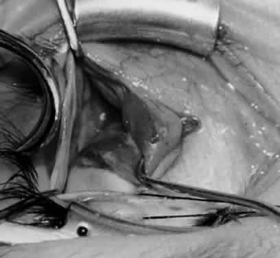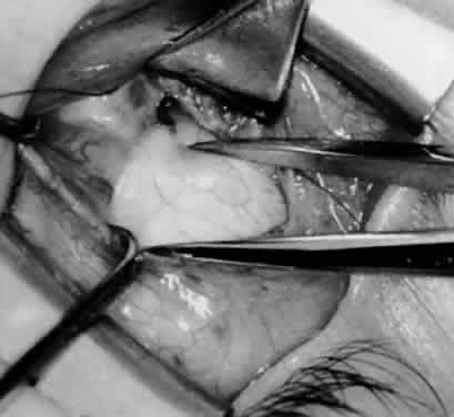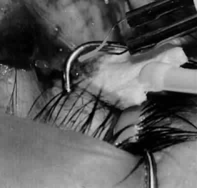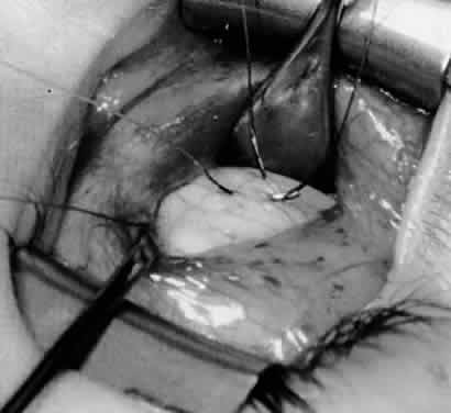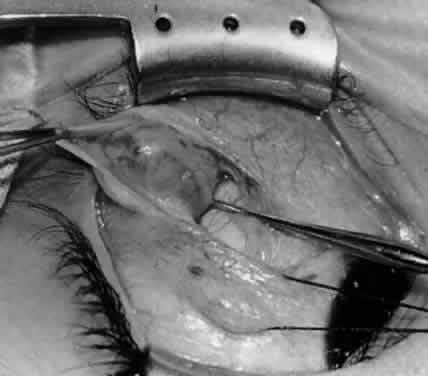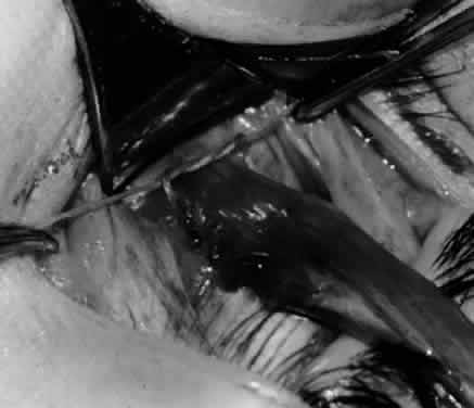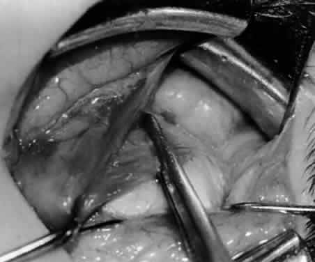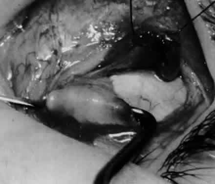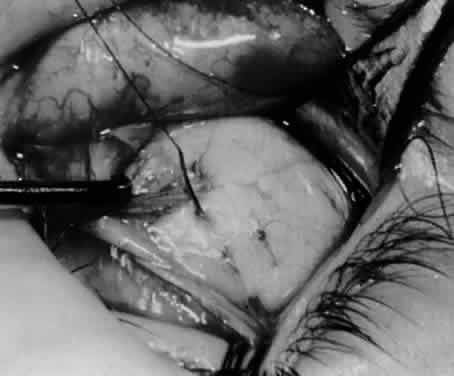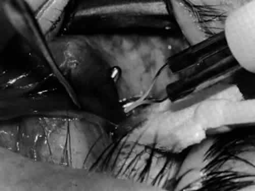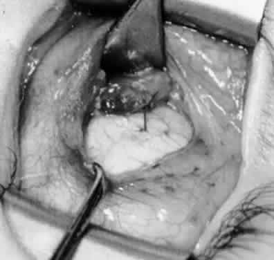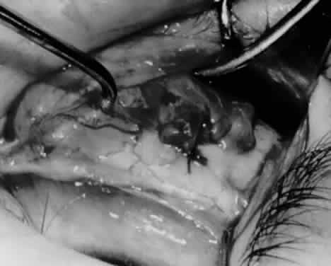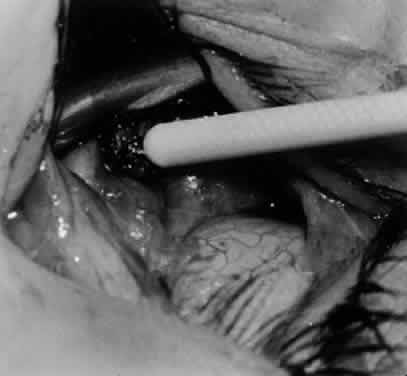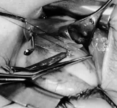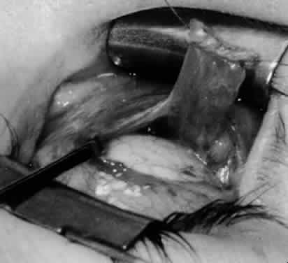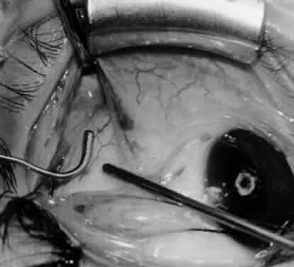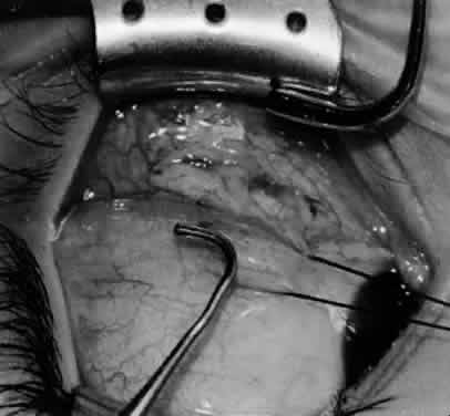 Ethicon, Somerville, NJ. Ethicon, Somerville, NJ. Because the inferior oblique muscle inserts near the macula, there may be concern about penetration of the macula with a preplaced suture, which can cause macula hemorrhage, visual impairment, or visual loss. An alternative is to place a hemostat near the insertion of the inferior oblique muscle and then section the muscle from the globe with the Aebli scissor. The 6-0 Vicryl suture can be placed within the muscle, which is grasped by the hemostat and a locked bite placed at the anterior and posterior borders of the muscle, before the muscle is reattached to the sclera at the intended position. The technique of removing the inferior oblique muscle with the hemostat is part of the denervation and extirpation procedure. The disadvantage of the recession procedure is the difficulty involved in performing the procedure within a small operative field with limited visibility, compared with the myectomy or disinsertion. With proper illumination, however, such as the surgeon wearing the operating headlight and exposure with the Desmarres or Conway lid retractor, the inferior oblique insertion readily can be seen for placement of sutures and separation of the inferior oblique from the sclera. Parks2,11 found that 15% of patients had a return of overaction with the recession procedure, compared with 79% with myectomy at the origin, 53% with disinsertion, and 37% with myectomy at the insertion. Short-term follow-up is not helpful with oblique muscle surgery because inferior oblique overaction can return gradually over 2 years.10 Therefore, long-term follow-up is necessary for proper evaluation of success. In a more recent report, Wilson and Parks14 found a 25% recurrence rate of inferior oblique overaction after surgery, with an average follow-up of 3 years. Only 6% of patients required repeat inferior oblique surgery, however. DENERVATION Gonzalez15 first described denervation of the inferior oblique muscle as a weakening procedure but also reported the return of overaction within the first postoperative year.16,17 The nerve to the inferior oblique is attached tightly to the posterior belly of the inferior oblique muscle, lateral to the inferior rectus muscle border. At this site is a fusiform enlargement of the belly. After the nerve is hooked posteriorly with a Stevens hook, cautery is used to sever the nerve and the accompanying artery and vein. The procedure of denervation is no longer used alone because of the likelihood of recurrence of the inferior oblique overaction but it is used as the foundation for the denervation and extirpation procedure. DENERVATION AND EXTIRPATION The denervation procedure (Figs. 21–32) allows the inferior oblique muscle to be released further into the operative field once the nerve has been sectioned (see Figs. 26 and 27). A 3-0 Vicryl suture ligature is placed around the inferior oblique muscle (see Fig. 28) as close to the Tenon's capsule penetration as possible. The inferior oblique is sectioned by cautery (see Fig. 29), just distal to the suture ligature. The cauterized stump is pushed through the opening in the Tenon's capsule (see Figs. 30 and 31) and a 6-0 or 7-0 Vicryl suture is used to close the opening, with either a running or a purse-string suture (see Fig. 32). The purse-string suture can be preplaced before the inferior oblique muscle is sectioned and closed after the muscle is sectioned. The advantage of the denervation and extirpation procedure is its ability to permanently correct 4+ overaction of the inferior oblique.10,18 In addition, it is the best operative procedure to eliminate recurring inferior oblique overaction after disinsertion, myectomy, or recession.10 Disadvantages include permanent underaction of the inferior oblique muscle in some patients. Pupil dilation can occur but the dilation usually is transient, clearing in 3 to 6 months.10,18