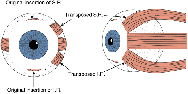 GENERAL INDICATIONS A muscle transposition procedure may be indicated when the function of one or more of the rectus muscles is absent or severely deficient as a result of third or sixth cranial nerve (CN-3, CN-6) palsy, lost muscle, type I Duane syndrome, supranuclear defects (as occur in double-elevator palsy), or in the rare case of congenital absence of one or more extraocular muscles. BACKGROUND Hummelsheim is credited with describing the first rectus muscle transposition procedure for treatment of paralytic strabismus in 1908.1 His procedure for treating the esodeviation that results from CN-6 palsy involved splitting the vertical recti and reattaching the temporal halves of each vertical rectus muscle adjacent to the insertion of the lateral rectus muscle. Several modifications to this procedure have been described, including those of O'Connor (1921),2 Berens and Girard (1950),3 Wiener and Scheie (1952),4 Hildreth (1953),5 Costenbader (1958),6 Schillinger (1959),7 Jensen (1964),8 Uribe (1968),9 and Knapp (1969).10 These modifications were reviewed by Helveston in 1971.11 More recently, alternatives have been suggested by Carlson and Jampolsky (1979),12 Kushner (1979),13 Rosenbaum and associates (1989),14 and Foster (1997).15 Even with these modifications, the original principle remains the same. All extraocular muscle transpositions that involve the rectus muscles shift forces of antagonist muscles to a rectus muscle that lies between them and acts in the opposite plane. For example, vertical recti are transposed nasally or temporally to enhance horizontal function, and horizontal recti are transposed superiorly or inferiorly to enhance vertical function. In this manner, a surgeon is able to alter both active contractile and passive elastic force vectors to augment the action of a deficient rectus muscle, improving alignment, ductions, and field of single binocular vision. The most widely used procedures for rectus muscle transposition are the full-tendon transfer combined with either chemodenervation or recession of the antagonist of the paretic muscle, the Hummelsheim procedure, and the Jensen procedure. The most common indication for muscle transposition is lateral rectus weakness secondary to acquired CN-6 palsy. Transposition is indicated less often for superior rectus weakness such as occurs in double-elevator palsy and least often for inferior rectus palsy. Transposition is also useful when a rectus muscle has lost attachment to the globe and cannot be found and reattached. This occurrence most commonly is a complication of medial rectus surgery. Superior oblique transposition can be used for medial rectus paralysis when the vertical recti also are compromised, an occurrence most often associated with CN-3 palsy. Techniques for this procedure have been described by Jackson16 and also by Scott.17 CONTRAINDICATIONS Restriction Muscle transposition alone is not effective when free movement of the eye is restricted. Some mild restriction, or stiffness, of the antagonist of a paretic muscle invariably occurs after several months. This restriction is due to the effects of the chronic contracture of the antagonist of the paretic muscle. In most cases, it can be relieved by recessing the muscle or treating it with botulinum. When restricted movement is caused by abnormal attachments of the orbital fascia to other orbital fascia or to the globe, the attachments must be freed by surgery before an extraocular muscle transposition is performed if the best result from this surgery is to be obtained. Vascular Insufficiency This surgery is relatively contraindicated in older patients who have significant vascular disease because such patients have an increased risk of developing anterior segment ischemia after surgery. This topic is covered more fully in the section of this chapter on complications. TECHNIQUES Full-Tendon Transfer Our preferred technique for muscle transposition is a full-tendon transfer. Any two antagonist rectus muscles can be used for the transfer, but the most common method involves transposing the vertical recti temporally to treat lateral rectus palsy. This procedure can be performed through two fornix incisions, for example, superotemporal and inferotemporal, or through a large, 240-degree limbal peritomy, such as from the 5-o'clock position clockwise around to the 1-o'clock position in the right eye. The superior rectus muscle is located, engaged on a muscle hook, and dissected from the overlying anterior Tenon's capsule and the intermuscular membrane at least 10 mm posteriorly. Attachments to the underlying superior oblique muscle also are divided. The muscle insertion is secured with a double-armed 6-0 absorbable suture (Vicryl, Biosorb) and disinserted from the globe. The inferior rectus muscle is exposed, secured, and disinserted in a similar fashion. Thorough dissection of the inferior rectus muscle from attachments to Lockwood's ligament is necessary to minimize lid fissure changes postoperatively. The superior and inferior rectus muscles are then reattached to the globe in juxtaposition to the lateral rectus insertion. We prefer to suture the vertical recti so that the temporal corner of the transposed muscle abuts the adjacent corner of the lateral rectus insertion. The nasal corner of the transposed muscle is attached so that the new insertion of this muscle coincides with the spiral of Tillaux (Fig. 1). The antagonist muscle, in this case the medial rectus, must often be weakened. Our preferred method is by chemodenervation with botulinum A toxin. This method, when successful, obviates the need for recession of a third rectus muscle. A single injection of up to 5 U of botulinum may be given at the time of surgery, with the site of injection in the muscle belly under direct observation. As an alternative, botulinum may be given before or after the transposition procedure with the aid of electromyographic localization. Some surgeons believe that there is a