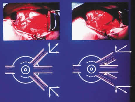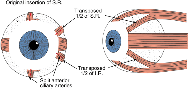 RESULTS The results obtained from the transposition procedure vary with both the technique and the underlying problem. Specific results are covered in the following discussions of several common indications. COMPLICATIONS Anterior Segment Ischemia Anterior segment ischemia is caused by compromising more than a critical amount of anterior segment circulation during strabismus surgery. This complication has been reported after detachment of only two rectus muscles, conversely, all four rectus muscles have been detached in other patients without producing this clinical picture. The risk of this complication increases whenever a third rectus muscle is detached in the same eye, especially if two of these muscles are vertical recti, because vertical recti do not have an associated posterior ciliary artery. If surgery on a fourth rectus muscle becomes necessary, a procedure that spares the anterior ciliary artery can be used,24 or botulinum injection to the muscle can be considered. |