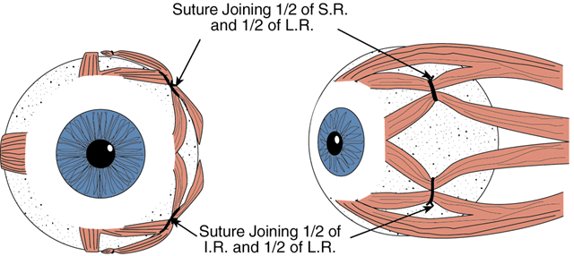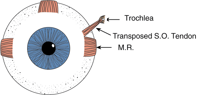 Lateral fixation suture-augmented transposition has been shown to increase the tonic force of the transposed vertical muscles significantly in cases of CN-6 palsy and type I Duane syndrome.15 This frequently results in satisfactory alignment and a larger diplopia-free visual field without requiring ipsilateral medial rectus recession (Fig. 4). Leaving the medial rectus unoperated reduces the risk of anterior segment ischemia or loss of adduction ability. The Hummelsheim Procedure The technique for the Hummelsheim procedure is similar to that already described for the full-tendon transfer, except that the muscle is divided along its long axis, and only half the muscle is transposed. The other half remains attached to the globe with some vasculature presumably intact. This procedure is indicated for cases in which preservation of anterior segment circulation is a special concern. Once the vertical recti have been identified, engaged on a muscle hook, and freed from surrounding attachments to intermuscular membrane and anterior Tenon's capsule, a small muscle hook is used to split the muscle and tendon, beginning at the insertion and extending approximately 15 mm posteriorly. The anterior ciliary arteries should be identified and the splitting done between the vessels, leaving intact the vessel in the half of the muscle that was not detached. That half of the muscle to be transposed is secured on a double-armed, absorbable 6-0 suture and disinserted. The same splitting procedure is performed on the direct antagonist. In a fashion similar to that used in a full-tendon transfer, the halves of the two muscles are then secured to the sclera, concentric with the limbus, at the edges of the insertion of the palsied or lost muscle (Fig. 5). The ipsilateral antagonist to the lost or palsied muscle should be weakened by chemodenervation or surgical recession, as already described above. The Jensen Procedure The Jensen procedure is performed by splitting the palsied muscle and joining the midportion of this muscle to the similarly split midportions of the two adjacent rectus muscles. The dissection and splitting are performed as described for the Hummelsheim procedure, but the muscles are not disinserted. Instead, a 5-0 nonabsorbable polyester fiber suture is used to join the muscle bellies to effect a union of the two muscles just anterior to the equator, as shown in Figure 6. This procedure has little advantage over the full-tendon transfer or Hummelsheim procedure, other than theoretically reducing the risk of anterior segment ischemia. However, anterior segment ischemia has been reported after the Jensen procedure,22,23 so choosing this technique does not ensure avoidance of this complication. Significant scar tissue formation occurs with the Jensen procedure, making subsequent surgical exploration more difficult when compared with other tendon transfer techniques. As with full- or half-tendon transfers, a weakening of the ipsilateral antagonist muscle is performed by chemodenervation or recession. Superior Oblique Muscle Transposition Before the superior oblique transposition is performed, the surgeon must verify that superior oblique muscle function is present. In the patient with complete CN-3 palsy, this function can be determined reliably by noting incyclotorsion of the involved exodeviated eye when the patient attempts to look down. A limbal peritomy is made in the superonasal quadrant sufficient to provide exposure to both medial and superior recti. Traction sutures placed at 11- and 4-o'clock positions in the right eye (1- and 8-o'clock positions in the left eye) can facilitate exposure before the limbal incision is made. Alternatively, exposure to both the superior oblique and medial rectus can be obtained through a superonasal fornix incision. The superior oblique is isolated and dissected free of surrounding fascial attachments along the tendon, following underneath and along the nasal side of the superior rectus. After the superior oblique tendon is engaged on a small muscle hook on the nasal side of the superior rectus muscle, a suture is placed around the tendon, passed beneath the superior rectus, and pulled temporally, thus exposing the superior oblique insertion. The tendon is freed of surrounding attachments from the insertion toward the trochlear cuff. Dissection is limited to the sub-Tenon's space to avoid fat prolapse, which can produce postoperative restrictions. A double-armed 6-0 absorbable suture is used to secure the superior oblique tendon at its insertion. The tendon is disinserted and brought down toward the superior edge of the medial rectus insertion. The superior oblique tendon will be redundant at this point. It is sutured to the sclera at the superior border of the medial rectus insertion at the point on the tendon that brings the eye to a centered position. It is unwise to shorten the superior oblique tendon excessively because doing so may produce an unwanted hypertropia or esotropia. Conversely, the tendon should not be left so long that the tonic contraction of the superior oblique muscle is not transmitted to the globe. After an appropriate length for the tendon is determined and it is sutured to the sclera, the excess tendon is excised (Fig. 7). A more physiologic, but also more difficult, superior oblique tendon transfer can be done after fracture of the trochlea. The trochlea may be fractured by passing a fine-tipped hemostat, spatula, or other instrument nasally along the tendon into the trochlea and then twisting or prying toward the orbit to force the arch of the trochlea open by fracture. The tendon then can be pulled free from the trochlea so that it passes straight to the new insertion site at the superior border of the medial rectus insertion. In adult eyes, the trochlea resists fracture, and the effort required to fracture it can lead to unintentional severance of the superior oblique tendon, making the transfer procedure impossible. For practical
