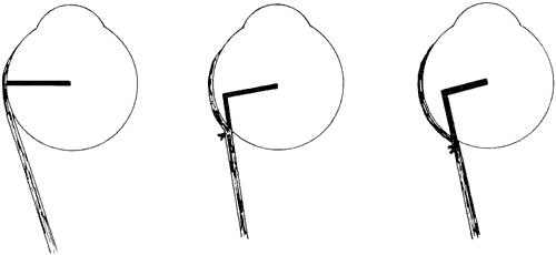 Heavy, nonabsorbable sutures should be used. Supramyd, a nonreactive suture type, does not drag tissue and is easy to tie. It is available in 5-0 diameter with short spatula needles. Mersilene and Dacron are more readily available, nonreactive, and can be procured in a 5-0 size with a short, flat spatula needle, such as the Alcon T-1 or D-5 models. It is helpful to have a short needle because the posterior surgical space is confined and the exposure is usually limited. The posterior fixation suture is placed at least 14 mm posterior to the original insertion when operating on the medial, superior and inferior rectus muscles. Placement of a suture 14 mm posterior to the insertion of the superior rectus requires identification of the posterior border of the superior oblique tendon and the adjacent vortex veins. Suturing into the sclera through the tendon may not provide adequate posterior fixation of the superior rectus. The tendon should be brought forward and the posterior suture placed behind it. Alternatively, an incision can be made through Tenon's capsule behind the superior oblique to give access to the sclera.8 Because of the long arc of contact of the lateral rectus muscle, the posterior suture would have to be placed at least 17 mm posterior to the original insertion; this is technically challenging because it is close to the macula. Scott25 has described an adjustable hang back technique which can be used on the lateral rectus using simultaneous resection and recession. This allows attachment of the muscle stump where the posterior fixation sutures would be. Because the muscle in front of this point is removed, an adjustable suture technique can be used or a hang back suture can be used to avoid suturing posteriorly. The muscle is allowed to hang back as much or more than the resection. He used scleral tunnels to prevent vertical displacement. His study described three patients with horizontal incomitance in his initial publication and he has since operated on another 20 patients without major complications (A.B. Scott, personal communication, 2000). Bock and associates26 described five patients in whom the muscle was adjusted and 7 others without adjustment. They found undercorrection but were cautious in the amount of resection done. There is not yet enough experience with this procedure to create a surgical nomogram. Potential serious problems include late overcorrection and difficulty in reoperation. Hoover27 described an adjustable technique with slip knots on both the posterior sutures and on the hang-back suture for the insertion. Kushner13 found that adjusting the hang back suture was effective without loosening the posterior fixation sutures. |