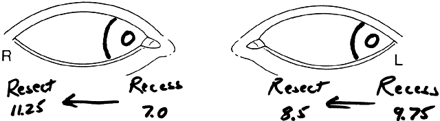 Anderson1 and Kestenbaum2 were the first to propose surgical procedures for the correction of anomalous horizontal head postures. Their surgical procedures were an attempt to move the null position toward the primary position. Many authors subsequently have addressed the surgical treatment of anomalous head postures associated with congenital nystagmus, most recently Scott,3 Mitchell,4 Biglan,5 and Kraft6 and their coworkers. Such corrective surgery has been shown to be beneficial by eye movement recordings. There is a shift of the null position toward the primary position and a decrease in the intensity of the nystagmus.7–9 In addition, the eye movement recordings demonstrate that the null region is broadened in some patients, allowing a wider angle of best visual acuity compared with the preoperative state. INDICATIONS The usual indication for such a surgical procedure is to reduce or eliminate an extreme head posture. Some patients are bothered by neck and back pain from longstanding torticollis. Others achieve the desired reconstruction of eye position, improved visual acuity, and improved stereoacuity. Preoperative evaluation mirrors that for any patient with nystagmus. A complete ophthalmologic history and examination is needed to elicit the cause of the congenital nystagmus. A pupillary examination for evidence of optic neuropathy or paradoxical pupillary reactions is prudent in the search for a sensory etiology. Electroretinography may be done if there is markedly reduced vision. Neuroimaging is not necessary, unless the nystagmus is acquired or there is optic atrophy. The examiner should observe the patient for at least 10 minutes to be certain that the preferred gaze direction is constant. Congenital nystagmus can present with a periodic, alternating waveform with two different null zones. In such a situation, a Kestenbaum-Anderson type of surgery would be potentially harmful. Four-muscle recession surgery has been suggested for these patients (see later).10 CONTRAINDICATIONS There are no absolute contraindications. Surgery probably is best deferred until at least age 4 or 5 years. This allows for the surgeon to more accurately determine the operative angle and for the patient to be visually mature. SURGICAL PROCEDURE The surgical approach for patients with straight eyes is to move each eye by an equal amount in the direction of the face turn. If there is a strabismus in addition to an anomalous head posture, the surgeon needs to decide whether to correct both in one operation or to pursue correction in two operations. The approach to the patient with straight eyes and an anomalous head posture follows: The operation should be viewed as one in which the surgeon mechanically moves the eyes in the direction of the face turn (opposite the gaze preference). Thus, a patient in left gaze with a right face turn would undergo a resection of the right lateral rectus, a recession of the right medial rectus, a resection of the left medial rectus, and a recession of the left lateral rectus muscles. The surgeon should take a diagram to the operating room clearly outlining the surgery to be performed (Fig. 2). It is easy during the course of the performance of the surgery to get confused about which muscle undergoes which surgical procedure. The amounts of surgery to be performed are controversial. The “classic” maximum amount of surgery was formulated by Parks and Mitchell.11,12 Their operation used the guidelines of 5-6-7-8 for the amounts of surgery. These were based on a 5.0-mm medial rectus muscle recession, the maximum medial rectus muscle operation of that period. In my example of a right face turn, the surgery would entail a 5.0-mm recession of the right medial rectus, an 8.0-mm resection of the right lateral rectus, a 7.0-mm recession of the left lateral rectus, and a 6.0-mm resection of the left medial rectus muscle. Notice that the millimeters of surgical correction provided are the same for each eye. Unfortunately, this amount of surgery left many undercorrected patients. Surgeons responded over the ensuing two decades by increasing the amounts of surgery beyond these “maximal amounts.”3,4,13 Before selecting the amount of surgery to be performed, the surgeon must determine the magnitude of the head turn. The patient views a letter chart at distance with the smallest size optotype visible. This helps to establish the maximum deviation. An orthopedic goniometer is one convenient tool for measuring the deviation.4 The head turn is measured in degrees, not prism diopters. The size of the head turn dictates the amount of surgical augmentation. For an anomalous head posture of 20° or less in the horizontal direction, an augmentation of 20% over the 5-6-7-8 guidelines is necessary. Surgical amounts are augmented by 30% for an anomalous position of 21° to 39°. An augmentation of 40% is necessary for head turns of 40° or more. The amounts of horizontal surgery for these head postures are listed in Table 1. Nelson and colleagues suggest that for head postures greater than 45°, an augmentation of 60% is beneficial.13 No other reports lend further substantiation to the efficacy of this marked augmentation.