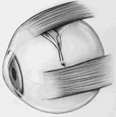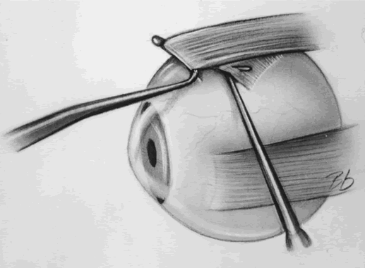 Both needles are then passed through the sclera at a point superior to the lateral rectus muscle, 6 to 8 mm posterior to its insertion, so as to pull the anterior portion toward that point (Fig. 5). In the Fells modification of the Harada-Ito procedure, the anterior half of the superior oblique tendon is disinserted and moved temporally and anteriorly, attaching it to the sclera near the superior border of the lateral rectus muscle17,18 (Fig. 6).