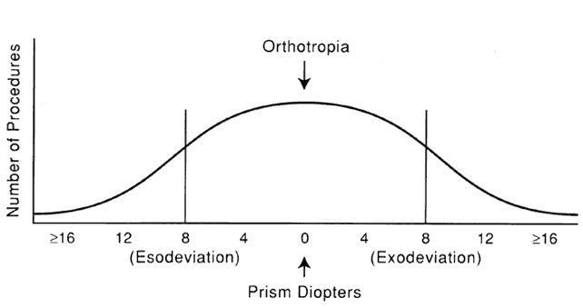 cosmesis. The exact effect of strabismus surgery for each individual patient is difficult to predict. For any type of strabismus procedure that is performed, there will be an expected number of patients who will be overcorrected, and this should be matched by an equal number of patients who are undercorrected.1 Results of strabismus surgery should fit a gaussian distribution (Fig. 1). If enough procedures are performed, surgeons will have patients with undercorrected and overcorrected strabismus through no fault of the surgeon.