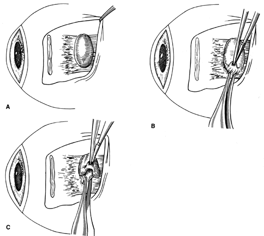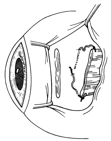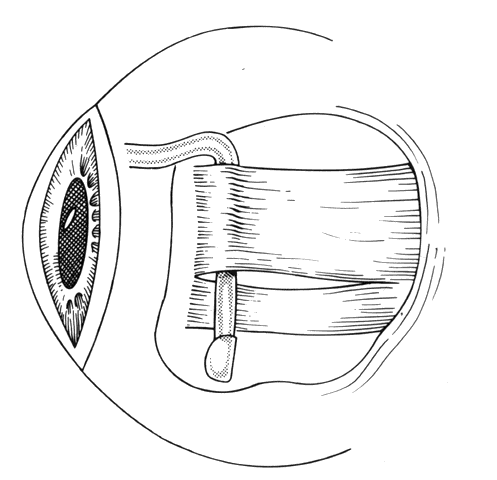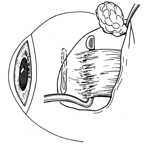 If a muscle has been lost, or has slipped from its original insertion, or when only the muscle capsule is attached to the globe and the actual muscle tissue has slid back through the muscle sleeve, the force generated by the muscle will be greatly diminished. Effort must be directed to finding and recovering the muscle tissue and reattaching it to the globe, thus restoring the contractile force of the muscle. Once disinserted, the most difficult muscle to find is the medial rectus muscle. This is because once the intermuscular membranes are cut, it has no attachments to other muscles and it can retract into the orbit. The other rectus muscles have attachments to other muscles that facilitate recovery. The superior rectus is attached to the superior oblique, the inferior rectus is attached to the inferior oblique, and the lateral rectus has attachments between the undersurface of the lateral rectus and the orbital surface of the inferior oblique. Once these attachments are identified, the small operculum in Tenon's capsule, through which the muscle sleeve passes, can usually be identified. When this operculum has been found, a forceps is used to grasp muscle tissue. If the patient has not been given atropine, bradycardia may occur when traction is applied to muscle tissue. It is important to avoid pulling Tenon's fascia forward in a blind attempt to find the muscle. This may cause the muscle to further retract from the opening in Tenon's capsule. It is preferable to gently displace the globe away from the area of surgical exploration with blunt retraction; vigorous rotation of the globe may cause further posterior slippage of the lost muscle. Once the muscle has been identified, it is helpful to place a locking Castroviejo forcep on the muscle or its tendon. This will reduce the chance that the recovered muscle will inadvertently slip out of the instrument and retract into the orbit. A hand-over-hand technique can be used to bring the remainder of the muscle tissue anterior. Once the muscle is brought anterior, a Jameson resection clamp can be applied to the muscle tendon. When a suture has been placed through the muscle, the clamp is removed (Fig. 41). The muscle can then be reattached to the globe in a position that, in the surgeon's best judgment, will provide the best alignment. Reattachment of the muscle to the globe may be difficult in the presence of retinal appliances, and in patients with high myopia or ectatic sclera. For these situations, a hang-back technique to reattach the muscle to sclera can be used. Conjunctival inclusion cysts may overlie the muscle insertion, be located more posterior, or be located on the underside of the rectus muscle (Figs. 42 and 43). These are dissected free and removed. If the epithelial cells are removed, they will not recur. Some epithelial cysts have been shown to be intimately attached to the rectus muscle, as part of a pseudotendon. Caution must be used not to disturb the muscle attachment to the globe when removing these cysts.