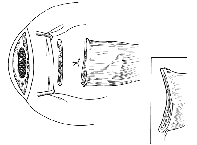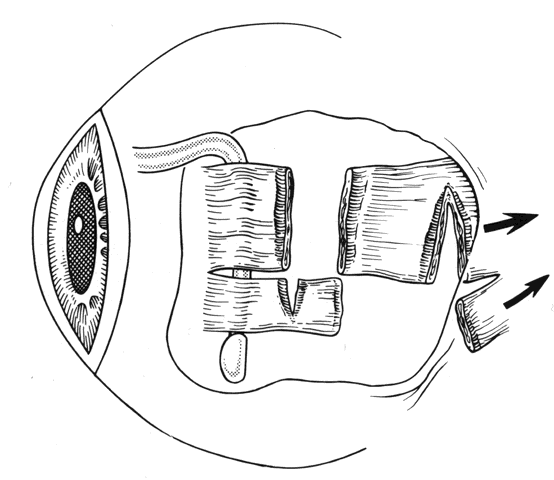 Circulation to the anterior segment comes from the anterior ciliary arteries that course with the rectus muscles and, to a lesser degree, from the conjunctival anastomoses at the limbus.36,41,42 McKeown and Lambert42 have devised a method to recess a rectus muscle while preserving this circulation. This technique, or one of its modifications, can be used to recess or resect a rectus muscle when preservation of the circulation to the anterior segment is important (Fig. 44). We have found that upon completion of the procedure, the injection of Decadron, 4 mg/mL, into the surrounding tissue tends to suppress the formation of scar and reduces the inflammation associated with the healing process.43 Others have also made this observation.44 Usually, cul-de-sac incisions are not closed. If the conjunctival incision gapes, it can be closed with an interrupted suture using 7.0 mild chromic or a 6.0 plain gut suture. If a limbal incision requires closure, care should be taken to ensure that the conjunctival surface adjacent to the cornea is not elevated. Elevated conjunctiva at the limbus may cause a focal point of drying of the cornea (dell or dellen). Many authors use the limbal approach for reoperations because it gives them the capability of performing a bare sclera closure. This reduces or eliminates the restrictive effects of contracted or scarred conjunctiva.8,10,45 Antibiotic-steroid ointment may be applied to the eye if the procedure is lengthy. If there has been a moderate amount of hemorrhage during the procedure, the surgeon may elect to apply an occlusive dressing on the eye. |