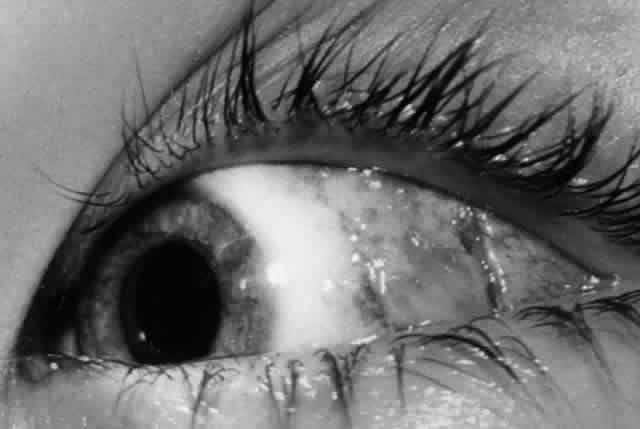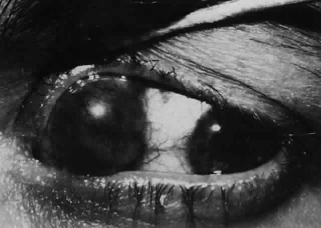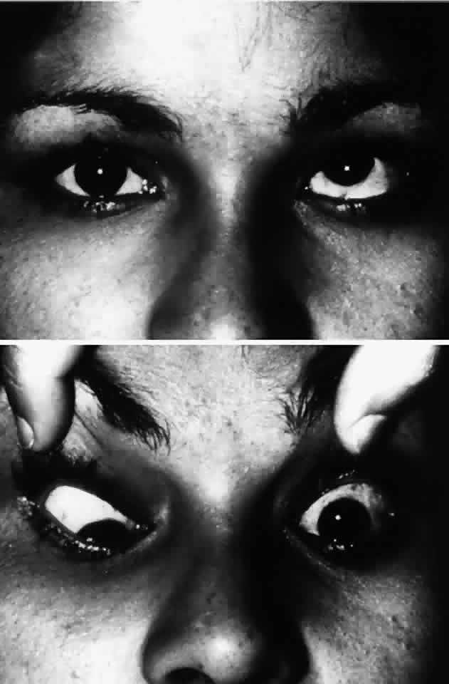 Whenever possible, efforts should be made to obtain information from the patient's history and from clinical records regarding the original diagnosis, preoperative measurements, and previous surgical procedures. In lieu of this information, some information can be obtained on examination. For example, slit lamp examination may disclose conjunctival scarring, which may suggest which muscles have had prior surgery (Fig. 7).