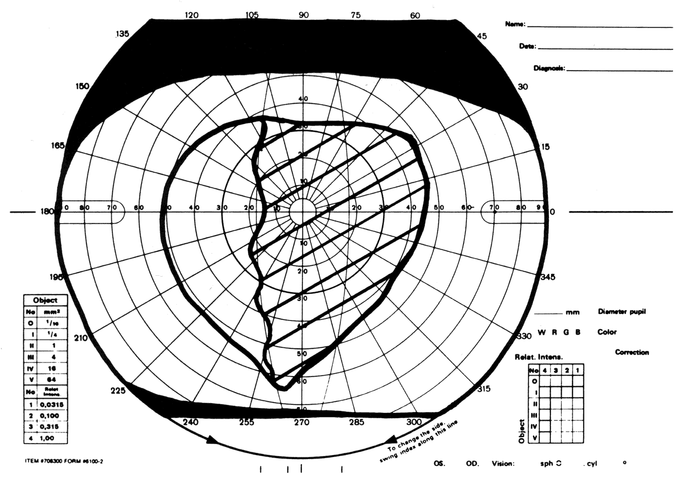 Analysis of the patient's sensorimotor development and consideration of factors such as identification of the preferred eye, evaluation of restriction, and the balance of force between the agonist/antagonist and yoke muscles will assist in developing a successful surgical strategy to correct the strabismus.1,2,4,5,8–11 The goal of evaluation of the sensory system is to determine the level of sensory fusion that can be expected when the deviation is corrected. This is important information because fusional control may effectively reduce symptoms of diplopia in the presence of a small residual deviation. In some patients, postoperative diplopia can be predicted. Diplopia may be anticipated in patients who have had an overcorrection of long-standing intermittent exotropia.7,11 In patients who are visually mature (over 8 years of age), diplopia can be expected if an overcorrected eye position causes images to fall outside of a pre-existing suppression scotoma. Prisms may be used preoperatively to evaluate this possibility. Age of the patient, chronicity of the deviation, and etiology of the original strabismus problem are all factors that will help to predict those patients who will be at risk for diplopia. Tests of binocularity, such as the Worth four dot test and Bagolini lenses, and tests to measure stereoacuity will indicate the potential for binocular cooperation in patients with intermittent deviations. In general, young children with strabismus usually have an ability to develop suppression and secondary adaptations such as anomalous retinal correspondence. In adults with acquired deviations, there is usually an inability of the sensory system to develop suppression, resulting in diplopia. In some instances, such as in closed head injury, or in long-standing unilateral visual loss that is rehabilitated (e.g., cataract removal), there may be central disruption of fusion wherein seemingly perfect realignment of the visual axes results in constant diplopia that cannot be fused by the patient.12 Disturbing and persistent diplopia may occur in patients who have orthotropia on cover testing but also have macular heterotropia related to a retinal detachment procedure or to preretinal membranes that distort the normal relationship of the fovea to the peripheral retina. When diplopia is present, it can be documented by performing binocular visual fields using a Goldmann perimeter (Fig. 8). This technique can be used before and after surgery to outline and quantitate the area of single binocular vision and diplopia.13,14 Binocular perimetry is also useful in explaining goals of surgery to the patient. For example, in patients who have a sixth cranial nerve palsy, it can be demonstrated that the area of single binocular vision will be shifted toward primary position and that in eccentric gaze positions diplopia may persist.