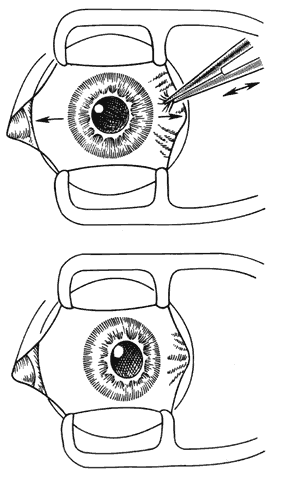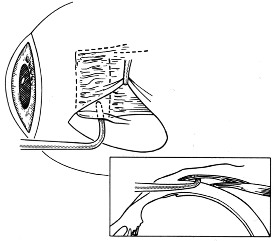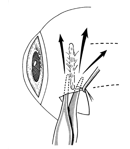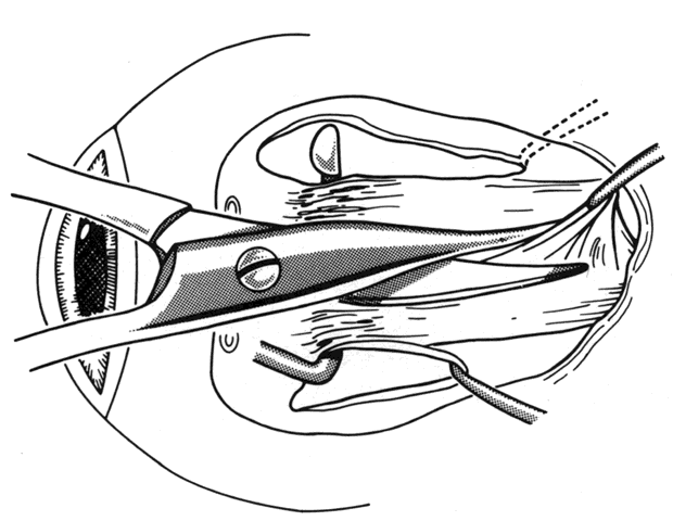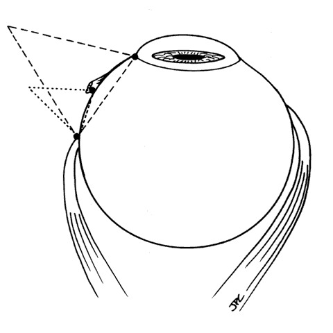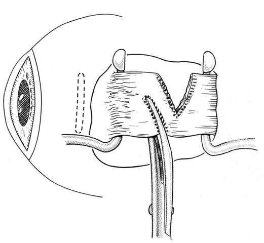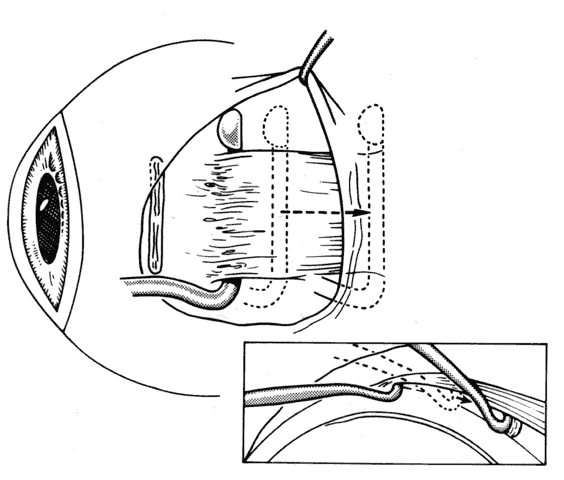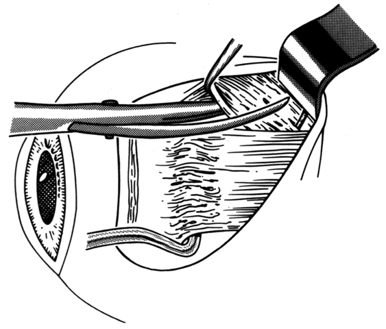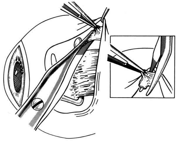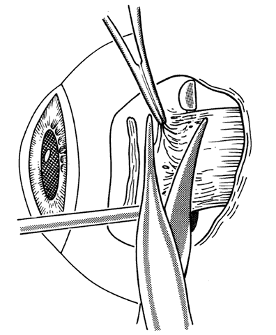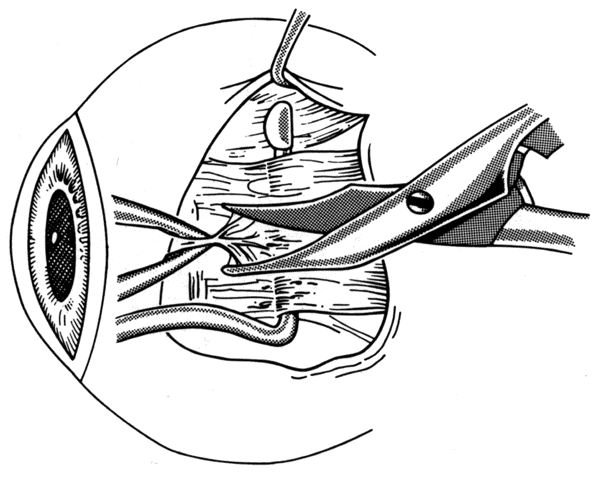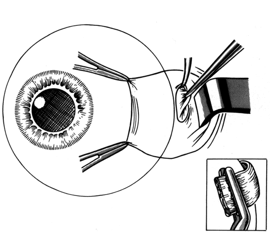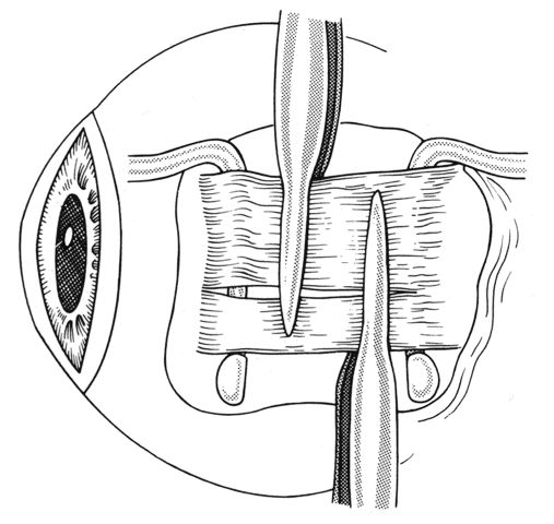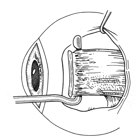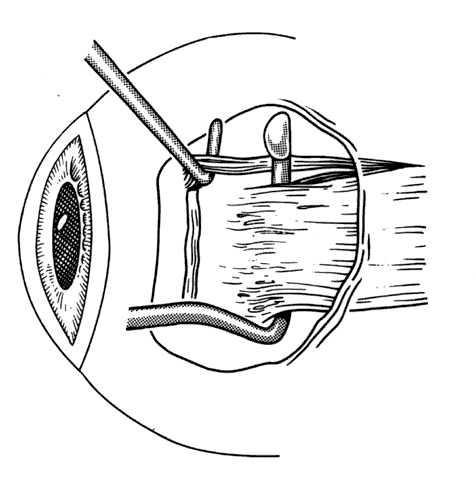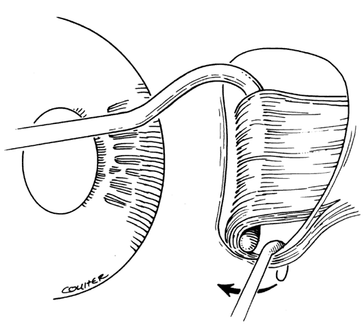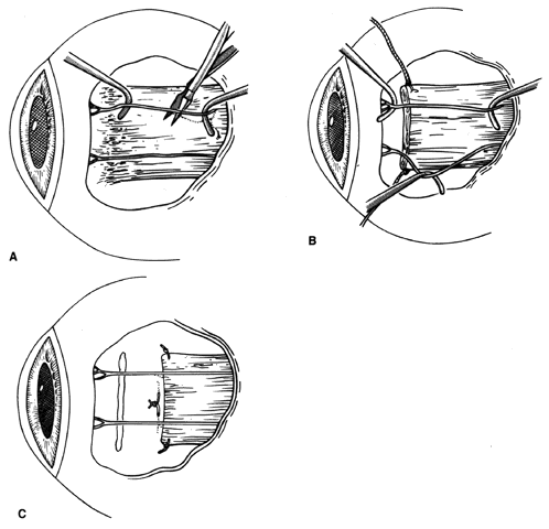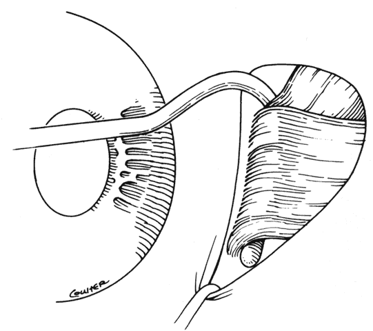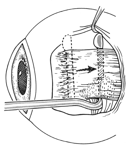 procedures. Sufficient exposure of the extraocular muscles and comfort of the patient and surgeon throughout a somewhat lengthy case is important. To achieve optimal exposure, a full complement of instruments to provide exposure is necessary and should include extra Stevens and Jameson muscle hooks, and instruments to retract tissue, such as <fr1/4>- and <fr1/2>-inch malleable ribbon retractors. These retractors are versatile and can be bent to enhance exposure of the muscle. Desmarres or Conway retractors are also helpful for retracting conjunctiva and Tenon's tissue, especially if the exposure is required anterior to the equator of the globe. Visualization during dissection is enhanced by using wet-field cautery to control bleeding. Sufficient illumination should be available for deep dissection to the equator of the globe. The surgeon should have a fiberoptic head lamp available. Stabilization of and traction on the globe can be facilitated by placing a locking 0.5-mm tooth Castroviejo forceps on the muscle insertion. A Jameson resection clamp is useful when working on a muscle that has been split or torn. This clamp will secure the muscle while preserving the width of the tendon so that repair can be accomplished. In difficult reoperations, the surgeon should request a pair of capable hands to assist him/her throughout the procedure. The anesthetic level should provide the patient sufficient comfort. The new rapid-acting intravenous sedation agents provide the surgeon with sufficient sedation to perform some procedures with topical or perimuscular anesthesia. This provides an opportunity for patient cooperation for intraoperative suture adjustment. Once the anesthetic has been administered, the surgeon can proceed with forced duction testing (Fig. 11). If the patient is under general anesthesia or a retrobulbar block has been used, the globe can be moved back and forth and then released to seek its natural position of rest. The “spring back balance test,” popularized by Jampolsky, Scott and Rosenbaum, provides the surgeon with information on the extent and location of restriction (Fig. 12). Forced ductions should include torsional forced ductions to determine if the oblique muscles are restricted.35 During forced ductions, the surgeon should observe the conjunctiva for underlying restrictive tissue bands. Adhesions between these bands and the conjunctiva will cause the conjunctiva to pucker. The incision should provide sufficient exposure and should be one the surgeon feels comfortable using. Our preference is to attempt to use a cul-de-sac incision whenever possible. This incision eliminates dissection through conjunctiva and anterior Tenon's capsule. When corrections require surgery on the superior rectus, conjunctiva is preserved for the remote possibility that a glaucoma filtering procedure may be required in the future (Figs. 13 and 14). The conjunctival incision can usually be made either through the old incision or just posterior to it.