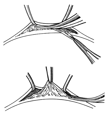 The insertion of a previously operated rectus muscle may have anterior extensions of scar tissue or even a pseudotendon. The term pseudotendon refers to fibrous tissue that extends from the surface of the true tendon (Fig. 26). If a muscle has been previously recessed, these attachments may extend anterior and become adherent to the original insertion. Care must be taken to identify “pseudotendons” and to separate them from the true tendon of the rectus muscle (Figs. 27 through 29).