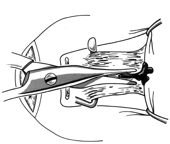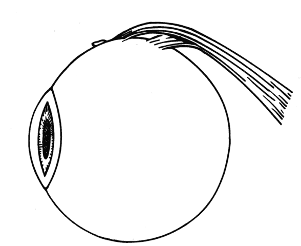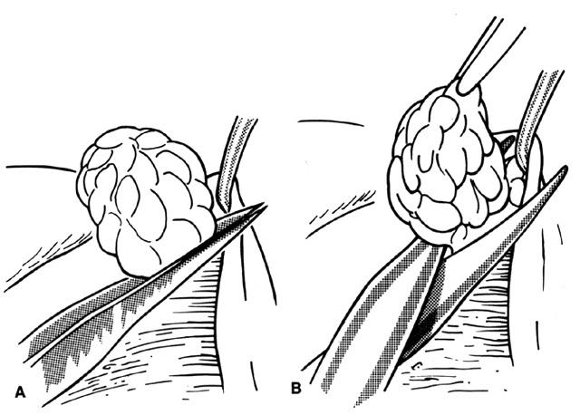 When dissections are carried posterior to the equator, fat will frequently prolapse into the operative field. When this occurs, it should be removed. The tissue should be identified as fat only. If a vortex vein is present, it can be cauterized and divided. Cautery is applied to the base of the fat and the fat is then excised with scissors (Figs. 34 and 35). Removal of excess fat is important because it will relieve restrictions on the globe and will also help to prevent additional restrictions from occurring.38