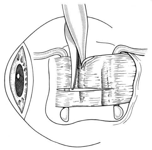 In rare situations, patients may have fibrotic bands that extend from the muscle and attach to the orbital wall or to the sclera posterior to the equator of the globe. Restrictive bands may also attach to posterior structures in the globe. These fibrous bands may be congenital or they may be found after previous ocular surgery. One of the authors (AWB) managed a patient who had a hypertropia caused by a congenital fibrotic band that attached to the sclera 3 mm superior to the optic nerve. The eye had a persistent hypertropia even after a large recession of the ipsilateral superior rectus and a myotomy of the inferior oblique muscle. Extreme care should be taken when approaching bands this far posterior. It is important to avoid injury to the optic nerve. If restrictive bands are suspected, MRI of the orbit may assist in defining the extent and location of these bands preoperatively. Once the muscle has been cleaned of surrounding adherent tissues, a synthetic absorbable suture is placed into the tendon and secured with lock knots at each pole. The entire muscle must be incorporated in the suture. Bands extending superior or inferior from the insertion (or medial or lateral in the case of vertical rectus muscles) should be cut so that when the muscle has been cut free from the globe, the globe is free to move without restriction. Frequently there will be residual bands of fibrous tissue located on the surface of the sclera. If the globe is pulled in a direction opposite the pull of the bands, these bands will indent the scleral surface, which will facilitate their identification. The passage of a Stevens hook across the sclera will frequently catch on the restrictive bands. Once identified, they can be cut with scissors. After this, the globe will be free to move without restriction. If a rectus muscle has been recessed 5 mm or more, further recession will put the new insertion at or beyond the arc of contact of the rectus muscle and the globe. This may cause decreased function of the muscle and produce noncomitant ocular rotations, especially in extreme gaze positions. To weaken a rectus muscle without disturbing its insertion site, a marginal myotomy can be performed.39,40 Usually, two separate cuts are made into the muscle near the tendon (Fig. 36) until the muscle lengthens. The weakening effect can be graded by increasing the number of cuts from two to three or by increasing the percent of the muscle that is cut. To be effective, a marginal myotomy should be accompanied by resection of the ipsilateral antagonist muscle. If a muscle tendon has been split during mobilization of the tendon or by passing a muscle hook under a scarred tendon, the marginal myotomy should be avoided. Placing cuts in the muscle may cause the muscle to be transsected (Figs. 37 through 40).