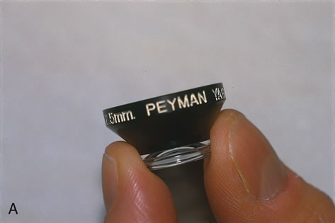 The child should be introduced to the equipment in a reassuring way (Fig. 9). The function of the safety switch on the head bar is explained, and the head is gently placed in front of the laser. The HeNe aiming beam is demonstrated, and steady fixation is practiced. Topical anesthetic is applied to both eyes. This anesthetic decreases the urge to blink. Some children may permit the application of the Peyman (Fig. 10) or Fankhauser lens on the cornea. The Lasag CGP lens is another lens that may be helpful for performing a capsulotomy. The advantage of using a contact lens is that the opacified capsule is easier to visualize and the contact lens will also help stabilize the eye. The optics of the lens permit capsulotomy to be performed at reduced energy levels, compared with performing the capsulotomy without a lens.30 Other children will not permit the application of a contact lens. In these situations, the Nd:YAG laser capsulotomy can be performed without the use of a contact lens, but applications that require higher laser power may be needed. Before treatment, the lens capsule should be closely inspected, and a strategy for where to apply the laser to perform capsulotomy should be planned (Fig. 11). Areas are noted where the lens capsule is thinnest and where the capsule appears to be under tension. A thin tense lens capsule is desirable because flaps of the capsule will separate when the capsule is photodisrupted. The preferred laser is set, and test pulses of I to 2 millijoules are set to be delivered in two- to three-pulse increments (Fig. 12). Alternatively, the laser can be set at I to 3 mj with single-pulse delivery. The Microruptor III (Lasag, Inc) provides the ability to treat patients in a supine position. For this instrument, settings of 0.7 to 0.9 millijoules of power, delivered in bursts of two to three, is a good starting point. The HeNe aiming beam is focused on the posterior capsule, and test pulses are applied to a peripheral part of the capsule until disruption is observed. There, power is increased until this occurs (Fig 13), If the eye does not have an intraocular lens, the beam is not defocused. When treating eyes with an intraocular lens, with the secondary membrane in close proximity to the posterior surface of the optic, the laser can be defocused. By defocusing the beam, the focal point of the laser in air is 0.4 mm posterior to the focus of the HeNe aiming beam. Using the retrofocusing mode provides an extra margin of safety and helps prevent pitting of the lens.