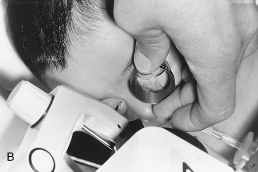 anesthesia is recommended. The pupil can be dilated according to the surgeon's preference. Some surgeons prefer not to dilate the pupil to ensure that the capsulotomy is placed in the aperture of the pupil (Fig. 8). Dilation, however, provides a margin of safety in a young child who may move unexpectedly. The dilated pupil will permit the surgeon to create a large capsulotomy without injury to the iris. To dilate the pupil, two applications of cyclopentolate HCL 1% or 2% combined with phenylephrine 2.5% are instilled (5 minutes apart) 20 to 30 minutes before the procedure.