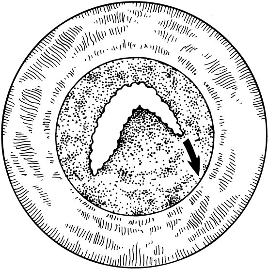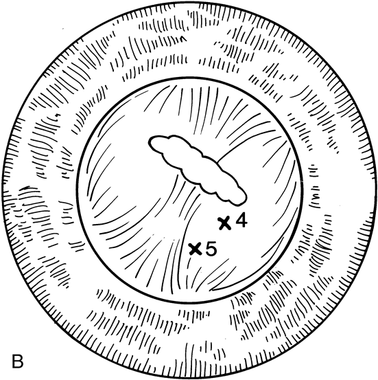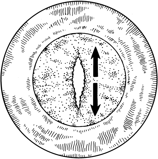 If the capsule is thin, the laser is used to create a vertical opening using 10 to 25 applications (Fig. 14). This is usually enough to create a sufficient opening. As shown by Capone and co-workers,31 it is not necessary to create a round capsulotomy. The posterior capsule will retract and increase the area of the opening, with a tendency toward sphericity. Attempts should be made to create an opening at least 4.5 to 5 mm in size. When the capsular membrane is thick, or if it does not look as though it will retract, the laser should be used to create either a triangular or a cruciate opening beginning at the 12 o'clock position and progressing down to the 5 o'clock and 7 o'clock positions (Fig. 15). This technique creates a flap that will usually roll posterior and provide a sufficient opening. Attempts should be made to avoid creating a free-floating fragment of lens capsule. Children who have undergone a capsulotomy and anterior vitrectomy may be left with an irregular pupil or one that encroaches upon the visual axis in one meridian. The Nd:YAG laser can be useful in cutting discrete adhesions between the iris and the posterior capsule. Care should be taken to identify any blood vessels when cutting membranes. Cutting a blood vessel with the Nd:YAG laser can cause bleeding in the anterior chamber. When this occurs, the bleeding usually stops spontaneously. If it does not, application of gentle pressure on the contact lens will raise the intraocular pressure and decrease the rate of hemorrhage. Bleeding may occur to such an extent that the anterior chamber becomes turbid and visualization becomes difficult.