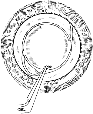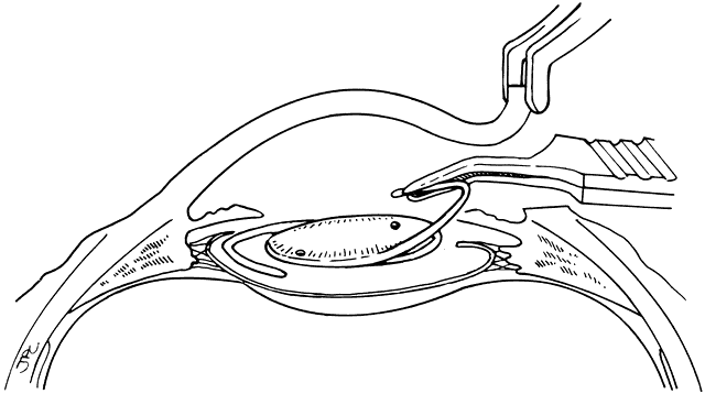 A peripheral iridectomy is performed in all patients as an added safety precaution and viscoelastic is removed before the wound is closed. In older children able to cooperate at the slit lamp microscope for suture removal, the wound is closed with interrupted 10-0 nylon sutures; suture removal is planned for 5 to 6 weeks after surgery. In young or uncooperative children, the sutures may be removed with an examination under anesthesia, also affording the opportunity for detailed examination of the eye, or interrupted 9-0 Polyglactin absorbable sutures may be used. The activity level of the young patient and possible eye rubbing are kept in mind during wound closure, and extra sutures are placed for added strength if there is any question about the integrity of the wound. A decision must then be made regarding the posterior capsule, PC opacification after extracapsular cataract surgery is caused by proliferation and migration of residual lens epithelial cells.42 This occurs as an age-related tendency, and virtually all pediatric patients develop capsular opacification over time.43 In an infant less than 1 year of age this may occur within the first several postoperative weeks. In an older child, opacification may take years to develop. One study of IOL use in children reported an average time to opacification of 2 years, regardless of patient age at the time of surgery and suggested primary capsulectomy-anterior vitrectomy at the time of implant surgery for children who are not expected to be candidates for YAG capsulotomy within 18 months of surgery.44 In patients less than 2 years of age, the risk of developing a thick membrane on which it would be difficult to perform YAG capsulotomy is significant and all these patients should have primary posterior capsulotomy-anterior vitrectomy procedures performed. If the patient can be expected to be cooperative enough for subsequent Nd:YAG laser capsulotomy, or if the facilities are available for performing YAG laser procedures on supine anesthetized patients, the capsule is left intact to avoid the potential complications of intraocular capsulotomy. It should be emphasized here that if this is the strategy taken, YAG capsulotomy must be performed in a timely fashion to avoid problems with amblyopia induced by the visual deprivation of capsular opacification and to prevent development of a thick membrane that may be resistant to YAG laser disruption using a reasonable amount of energy. If posterior capsulectomy-anterior vitrectomy is to be performed at the time of implant surgery, after the implant wound is closed, a vitreous cutting instrument is used from the pars plana, posterior to the posterior capsule and IOL.45 An infusion cannula is placed into the AC and a stab incision is made for the cutting instrument 1.5 to 2 mm posterior to the limbus. A central posterior capsulectomy is then made with removal of the anterior vitreous. Generous vitrectomy should be performed in infants and young children. SECONDARY PC IOL IMPLANTATION Capsular Support Present If the cataract surgery has been performed, leaving a rim of capsule present, secondary implantation of a PC IOL into the ciliary sulcus is then performed. The anterior and posterior capsular flaps having sealed together will thus form a so-called shelf to help guide and support the haptics in the ciliary sulcus.46,47 Preoperative evaluation of pupillary dilation, the integrity of this capsular shelf, and examination for iridocapsular synechiae are important. If pupillary dilation is seen to be poor or if synechiae are present, a paracentesis tract should be planned. An iris or Sinskey hook is used for retraction of the iris to aid in examination of the iridocapsular relationships. Synechiae may be lysed with viscoelastic, an iris spatula, or, frequently, they may need to be cut with a discission knife (Fig. 6). A technique for in-the-bag secondary IOL implantation is selected patients has been described by Wilson and coworkers.48 In this technique, if Sommering's ring is present, with a ring of reproliferated cortex present between the lens equator and the fused anterior and posterior capsular leaflets, the capsular bag may be reopened to allow placement of the haptics within the bag. Those authors suggest limiting the anterior and posterior capsulectomy performed during the initial cataract surgery to a smaller than usual 4 to 5 mm and the performance of generous anterior vitrectomy to aid in preventing closure of the capsulectomy. The success of this technique in reliably producing the required capsular conditions without producing problems with synechiae or secondary membranes has not yet been demonstrated. Capsular Support Absent Several techniques have been advocated for suture fixation of PC IOLs into the ciliary sulcus since the concept was first described by Girard.34,35,46–59 Important improvements are the use of an implant with holes at the apex of each haptic to make fixation of the sutures to the haptics easier and less likely to malposition, and incorporation of conjunctival-scleral flaps to sequester the suture knot to prevent erosion and the increased possibility of endophthalmitis. Fixation of the haptics at slightly oblique meridians helps avoid the major arterial vessels of the iris and ciliary body and also decreases the chances for hemorrhage with the passage of the fixation sutures.24 SECONDARY AC IOL IMPLANTATION Secondary AC IOL implantation in pediatric patients is performed in the same manner as that used in adults. There may be some advantage to a horizontal orientation of the haptics over a vertical orientation. If a peripheral iridectomy is present superiorly, horizontal orientation avoids it. There is also some suggestion that chronic discomfort after AC IOL implantation, particularly if too large a lensis implanted, may be avoided with horizontal placement. |