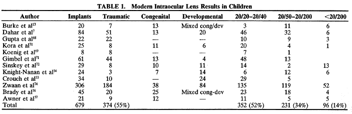 are better than those in the no longer current literature. Hiles presents data comparing the visual results achieved with glasses, contact lenses, IOLs, and epikeratoplasty over a decade of use.14 For traumatic cataracts and for unilateral cataracts of varying diagnoses, the results are similar for all these modalities. These data do not, however, help in providing a more definitive answer to the question of whether lens implantation should be used more widely or for any particular patient or type of cataract. Any examination of visual results after cataract surgery in the pediatric age group must take into consideration the multiple variables involved in visual outcome. Beginning with diagnosis, especially in the traumatic and congenital groups, the coexistence of other anatomic impairments to the development of vision may profoundly influence visual result. The age of the patient at development of visual deprivation and the delay until surgery and optic correction are performed may have a much greater impact on visual result than which optical rehabilitation modality has been selected. The definitions of congenital and developmental types of cataracts are not used in a uniform fashion, thus affecting the interpretation of visual results. For example, posterior lenticonus cataracts are considered congenital cataracts by some authors, leading to much better results than those achieved in series of congenital cataracts limited to complete opacities present at birth. Finally, and perhaps most significantly, the level of compliance with optical correction and amblyopia occlusion therapy certainly influence visual results greatly. Examination of only those reported series of patients, in all diagnostic categories, who have received modern PC or AC IOLs reveals that 52% achieved visual acuity of 20/40 or better, 34% achieved visual acuity between 20/40 and 20/200, and 13% achieved visual acuity worse than 20/200 (Table 1). In the compilation of this data, patients who were too young to have formal visual acuity measurements recorded and who were reported as having central fixation responses were, conservatively, considered as having less than 20/200 visual acuity. Trauma caused the cataract in 55% of these patients, decreasing the effect of amblyopia in many of these patients.