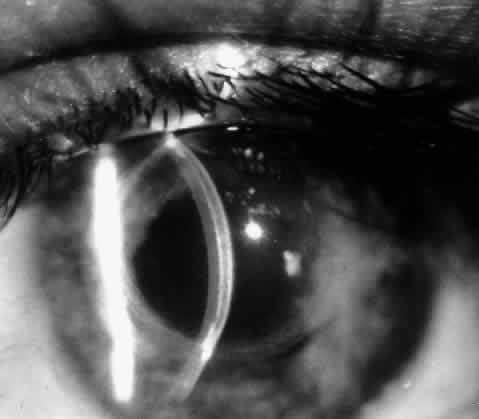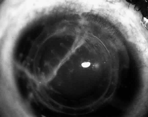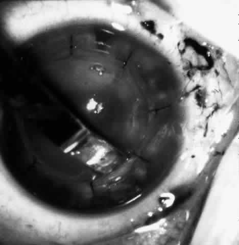Epikeratophakia has been used to correct aphakia in adults5 and children,6,7 as well as myopia,8 and to treat keratoconus.9 However, only epikeratophakia for pediatric aphakia is discussed here. The first pediatric patients to undergo epikeratophakia were children with unilateral congenital or traumatic cataracts who were either intolerant to contact lens wear or who were considered to be poor candidates for successful contact lens wear.10–14 Although the procedure was originally envisioned as a permanent optical correction for young children with unilateral congenital cataracts, it soon became apparent that epikeratophakia was not well suited as a first or sole solution to this problem because it could not achieve the very high power correction required for neonates and infants.15 Also, the rapid changes in refraction in the first year of life required a more flexible and easily changed optical prosthesis. For these reasons, epikeratophakia has been recommended for contact lens-intolerant, aphakic children who are 1 year of age or older. In these cases, the changes in dioptric power requirements that occur with the passage of time can be corrected with changes in spectacle overcorrection.15 Children who have traumatic cataracts with corneal lacerations are well served by this procedure because the injury often destroys the capsular support that can be used to stabilize an intraocular lens.16–18 The epikeratophakia graft provides structural support for the weakened cornea and minimizes the induced irregular and regular astigmatism, in addition to correcting the optical error (Figs. 3 AND 4).