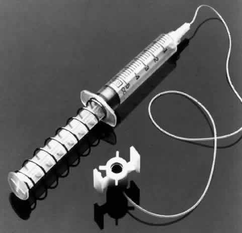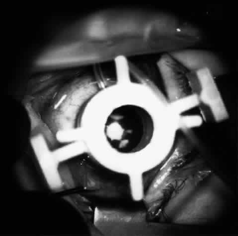 POWER CALCULATION After a complete ophthalmologic examination, the child may be sedated with chloral hydrate, if necessary, and keratometry and retinoscopy are performed. A-scan axial lengths must be obtained when retinoscopy is not possible. The measurements provide the parameters for ordering the tissue lens, which is prepared at a commercial facility and shipped to the hospital. There have been technical difficulties in calculating powers for young children. The most commonly utilized formulas were designed for adult eyes and when they were used for short eyes with steep corneas, as seen in infants, the results were erroneous.22 Newer formulas seem to alleviate this problem.23,24 However, no formula is ever as accurate as retinoscopy in children's eyes. Thus, retinoscopy should be used whenever possible-either with trial lenses alone or with trial lenses over an aphakic trial lens. The power obtained with retinoscopy is corrected to the corneal plane and, in an older child (perhaps after the second birthday), one may wish to add 2D to achieve a mild overcorrection. This addition is not necessary in a child under the age of 2, who will continue to become more myopic over the ensuing years (Fig. 5). The maximum power achievable with an epikeratophakia tissue lens appears to be in the vicinity of +25D. TISSUE PREPARATION Tissue preparation has evolved considerably since the days of the early Barraquer procedures. For epikeratophakia, the commercial provider obtains fresh donor tissue, dehydrates it by means of a cornea press, shapes it to the correct optical power, and lyophilizes it for transport and storage. Unfrozen tissue that is shaped and stored in a moist chamber for shipping is also available commercially. Some individuals who have access to a cryolathe still prefer to use either Barraquer's original formulas or some modification thereof for preparing their own tissue. SURGICAL TECHNIQUE At the time of surgery the child is taken to the operating room. No specific premedication or antibiotic regimen is required. Since children undergo this procedure under general anesthesia, there is no reason to mark the visual axis with the child awake. If a lyophilized lenticule is to be used, it is placed in a balanced salt solution to be rehydrated. Care should be taken to keep the tissue lens away from contact with any surface that could be contaminated with soap or other chemical residues that could be absorbed by the lenticule and hinder epithelialization. A low concentration of gentamicin (0.3 ml of 40 mg of injectable gentamicin per milliliter in 20 ml of balanced salt solution) is sometimes added to the hydration solution, although the value of this in preventing infection has not been proved. The lenticule generally is hydrated for 20 minutes prior to suturing. The first step in the surgical procedure is to move the epithelium from the patient's cornea with gentle mechanical abrasion. A 4% solution of cocaine that has been millipore-filtered or absolute alcohol may be used to facilitate deepithelialization. Drying the epithelium has been advocated to ease removal, but this approach results in changes in the texture of the corneal surface which make it difficult to attach the trephine in the next step. A Hessburg-Barron vacuum trephine (Fig. 6) measuring 7 mm in diameter is used to make a partial depth (0.2 to 0.3 mm) incision into the corneal stroma centered on the optical axis (Fig. 7). In adults, the optical axis is marked prior to surgery while the patient is still awake. In children, this procedure may be difficult because their amblyopia may prevent central fixation or the fixation may be unsteady. One trick that is often employed is for the surgeon to note the position of the visual axis in the fellow eye and recall that as a landmark in the eye to be operated on. For example, if the fellow eye shows a large positive or negative angle kappa, the surgeon may take that into account and shift the centration of the epikeratophakia lens on the surgical eye appropriately. It has empirically evolved that a 1.5-mm difference in size between the trephine and the lens works well to achieve the correct power; thus, with a 7-mm trephination, the tissue lens is generally 8.5 mm in diameter. In the past, trephination was followed by the creation of an annular keratectomy, in which a wedge of tissue was removed from the inner aspect of the trephine cut. The use of this keratectomy has been abandoned, however, because of the technical difficulties involved in making the thin incision and the scarring that sometimes occurred as a result of this procedure.