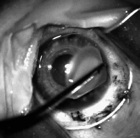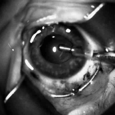 At this point, if intraocular surgery, that is, cataract extraction, pupilloplasty, or membranectomy, is to be done, it is performed through a limbal incision with a vitreous cutting instrument such as the Microvit or Ocutome (Fig. 8). The limbal incision may be closed with 8-0 polyglactin 910 (Vicryl) sutures. After the intraocular procedure is completed and before the epikeratophakia procedure is resumed, it is important to return the eye to normal pressure by injecting balanced salt solution. I prefer to accomplish this with a 30-gauge sharp paracentesis injection through clear cornea.
