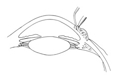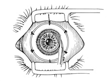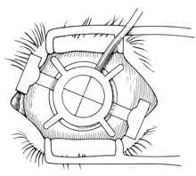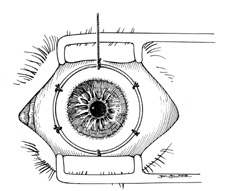 and preoperative ocular massage can be used to reduce vitreous pressure. The donor should be at least 2 years of age. Younger corneas are less rigid, making tissue handling and suturing more difficult. They produce steeper postoperative corneas, which can reduce hyperopia from aphakia, but the postoperative refractive error is unpredictable and astigmatism appears to be a greater problem.15 A Flieringa ring or McNeill-Goldmann blepharostat should be sutured to the globe to provide scleral support. One or two of the suture ends can be left long for fixation (Fig. 1). The center of the cornea and eight radial marks can be marked with a surgical pen and a radial keratotomy marker to guide suture placement. Alternatively, some trephines (e.g., Barron Recipient Trephine, Katena) are designed to create evenly spaced marks on the recipient cornea.