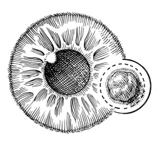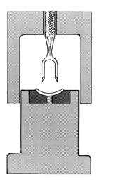 A hollow shaft trephine is also used to cut the recipient cornea. A suction trephine (e.g., Hanna trephine, Barron recipient trephine) facilitates centering and verticality of the cut, and may leave marks for suture placement (Figs. 3 and 4). The trephine is centered on the corneal mark, and a cut of approximately two-thirds depth is made. The anterior chamber is then entered with a knife at the 9 to 10 o'clock (for a right-handed surgeon) position. Right- and left-handed corneal scissors are used to extend the incision (Fig. 5). The scissors are tilted slightly to create a posterior ledge of host cornea, which helps seal the posterior wound. Care is taken to cut the full thickness of the cornea, so Descemet's membrane is not left in the eye, and to avoid damage to the iris and lens. Introduction of viscoelastic material into the anterior chamber may facilitate excision of the host cornea. It may be necessary to separate anterior synechiae, using blunt or sharp dissection. Vitreocorneal and corneolenticular adhesions are cut with scissors.