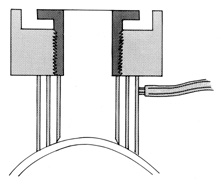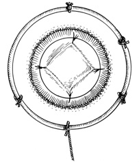 Usually the lens and iris move forward as soon as the eye is opened, and visualization and division of peripheral iris synechiae is difficult. Often it is best to close the wound first and lyse synechiae afterward. If iris-lens prolapse occurs, external pressure on the globe from the lids and speculum should be reduced as much as possible. Instead of a speculum, sutures can be placed in the lid margin before trephination, to obtain exposure. Hyperventilation of the patient also can help. Of course, the graft should be sutured in place as expediently as possible. If necessary, shallow sutures can be placed initially and replaced once more control is obtained. Pars plana vitrectomy can be performed to reduce vitreous pressure. Pars plana incisions in an infant should be 2 to 3 mm from the limbus and lens damage can occur during the procedure. Bleeding from the cornea or iris usually ceases with time and irrigation. Dilute solutions of epinephrine (e.g., 3 mL 1:10,000 in 500-mL saline) may be helpful. If iris bleeding continues, wet field cautery or a retinal diathermy unit can be applied to the vessel. If cataract extraction is necessary, an anterior capsulorrhexis is optimum. This is started with a cystotome and completed with Utrata forceps. However, the capsulorrhexis often extends peripheral and capsulotomy must be performed with a needle, knife, or scissors. The soft lens nucleus is expressed or removed by a mechanical cutting and suction instrument, and cortical material is removed by irrigation and aspiration. A central posterior capsular opening is created. Anterior vitrectomy is performed with a mechanical suction and cutting device. Constant irrigation is not necessary. Vitrectomy is continued until the remaining vitreous is well posterior to the iris plane. The anterior iris surface is dabbed with cellulose sponges, to ensure removal of all vitreous strands. The anterior chamber is re-formed with balanced salt solution, and viscoelastic material is placed centrally over the lens, if present, and on the peripheral recipient rim. The donor cornea is transferred to the bed and sutured into place with four interrupted 10-0 nylon or 9-0 silk sutures (Fig. 6). A double-pronged forceps (e.g., Pollock) facilitates placement of the initial 12 o'clock suture in the donor (Fig. 7). Care must be taken to minimize endothelial damage. The graft is stabilized against the recipient opening superiorly by pulling the tissue with the forceps. The needle is passed radially between the tips of the two-pronged forceps, minimizing movement of the donor tissue.